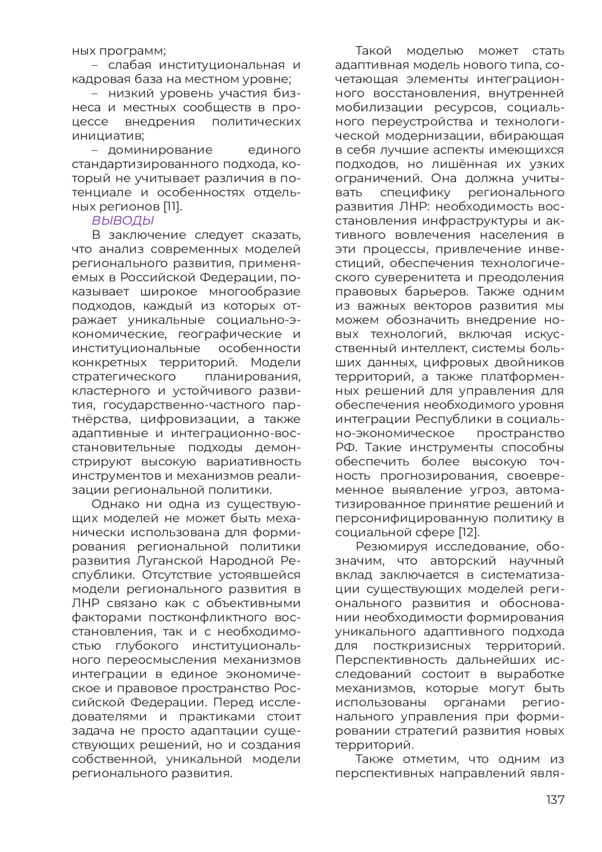 11. Козлова Н.Ю. Проблемы и перспективы реализации региональной политики в Российской Федерации // Экономические и социальные перемены: факты, тенденции, прогноз. 2023. № 2. С. 143-160.