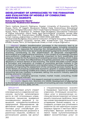 Современные трансформационные процессы в экономике обусловливают повышение роли интеллектуального капитала и нематериальных активов, в том числе консалтинговых услуг как ключевых ресурсов обеспечения конкурентоспособности организаций. Консалтинг представляет собой один из наиболее динамично развивающихся сегментов экономики знаний, способствующий распространению передовых управленческих, технологических и организационных решений. В условиях усложняющихся социально-экономических вызовов особенно важным становится формирование устойчивых и адаптивных моделей функционирования рынков консалтинговых услуг, что позволяет повысить эффективность бизнес-практик и управленческих решений в различных секторах экономики. В статье рассматриваются актуальные вопросы формирования и оценки моделей рынков консалтинговых услуг в условиях усиливающейся цифровизации и трансформации бизнес-процессов. Обоснована необходимость совершенствования оценки рынка консалтинговых услуг как одного из факторов обеспечения устойчивого экономического роста. На основе анализа существующих моделей и критериев предложен авторский подход к оценке рынков консалтинговых услуг с учётом отраслевых особенностей и ключевых экономических показателей.