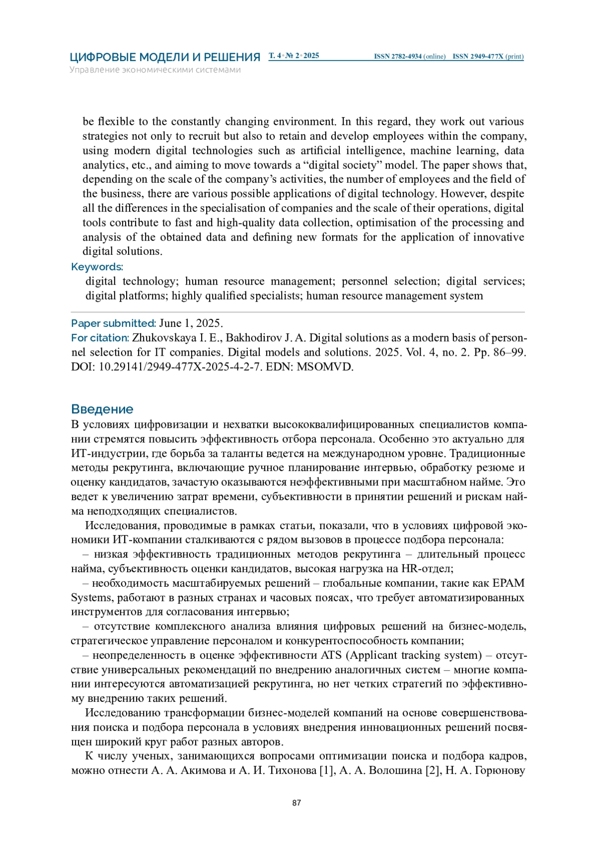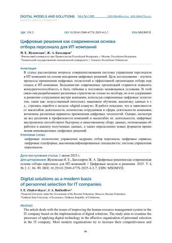В статье рассмотрены вопросы совершенствования системы управления персоналом в ИТ-компании на основе внедрения цифровых решений. Цель исследования – изучить процессы применения цифровых технологий в эффективной организации отбора персонала в ИТ-компании. Большинство современных организаций стараются повысить конкурентоспособность и быть гибкими к постоянно меняющимся условиям. В этой связи они разрабатывают различные стратегии не только по подбору, но и по удержанию и развитию сотрудников внутри компании, используя современные цифровые технологии, такие как: искусственный интеллект, машинное обучение, аналитику данных и т. д., стремясь перейти к модели «digital-социум». В работе показано, что в зависимости от масштабов деятельности, количества сотрудников и сферы деятельности компании, возможны различные варианты применения цифровых технологий. Однако, несмотря на все различия в профильности компаний и масштабах их деятельности, цифровые инструменты способствуют быстрому и качественному сбору данных, оптимизации обработки и анализу полученных данных, а также определению новых форматов применения инновационных цифровых решений.