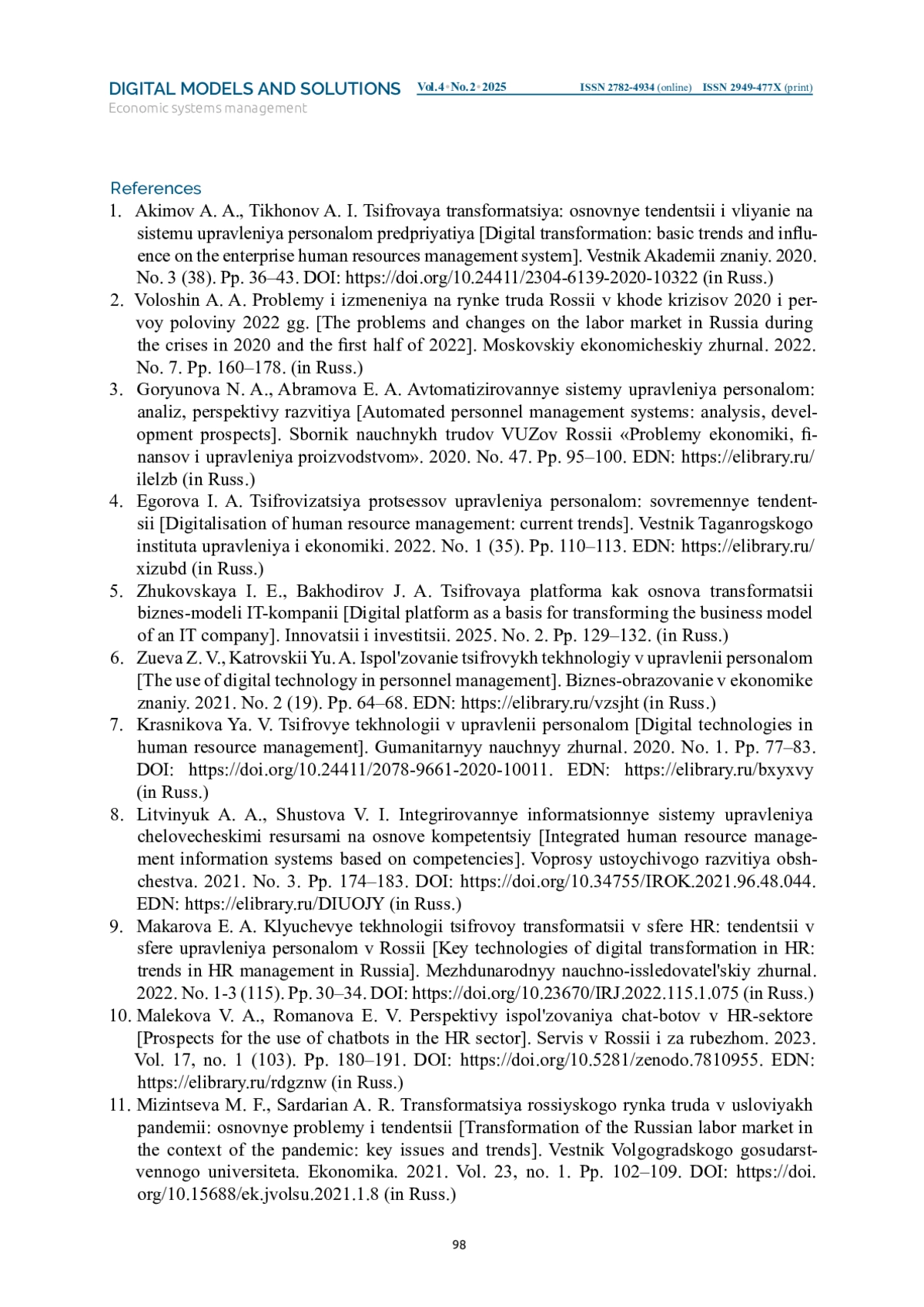 9. Макарова Е. А. Ключевые технологии цифровой трансформации в сфере HR: тенденции в сфере управления персоналом в России // Международный научно-исследовательский журнал. 2022. № 1-3 (115). С. 30-34. DOI: 10.23670/IRJ.2022.115.1.075 EDN: HINHZH