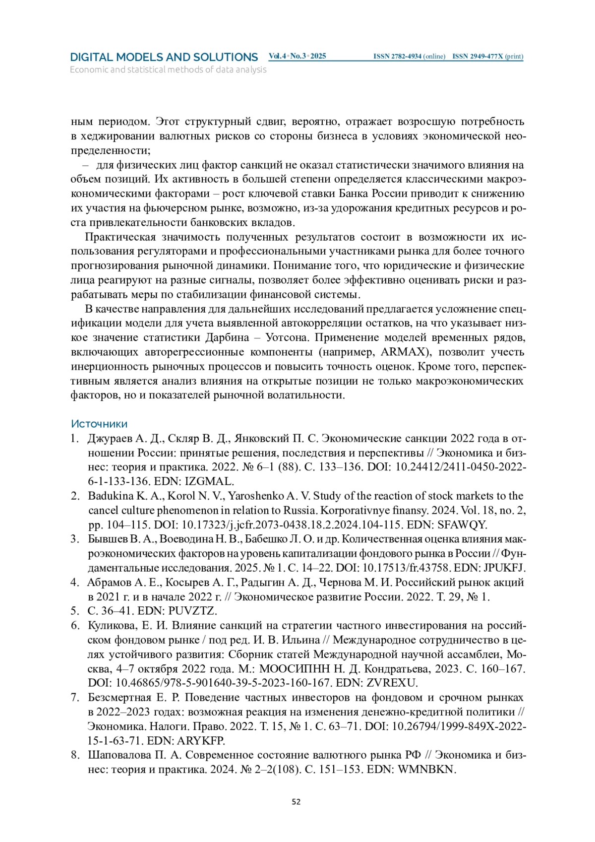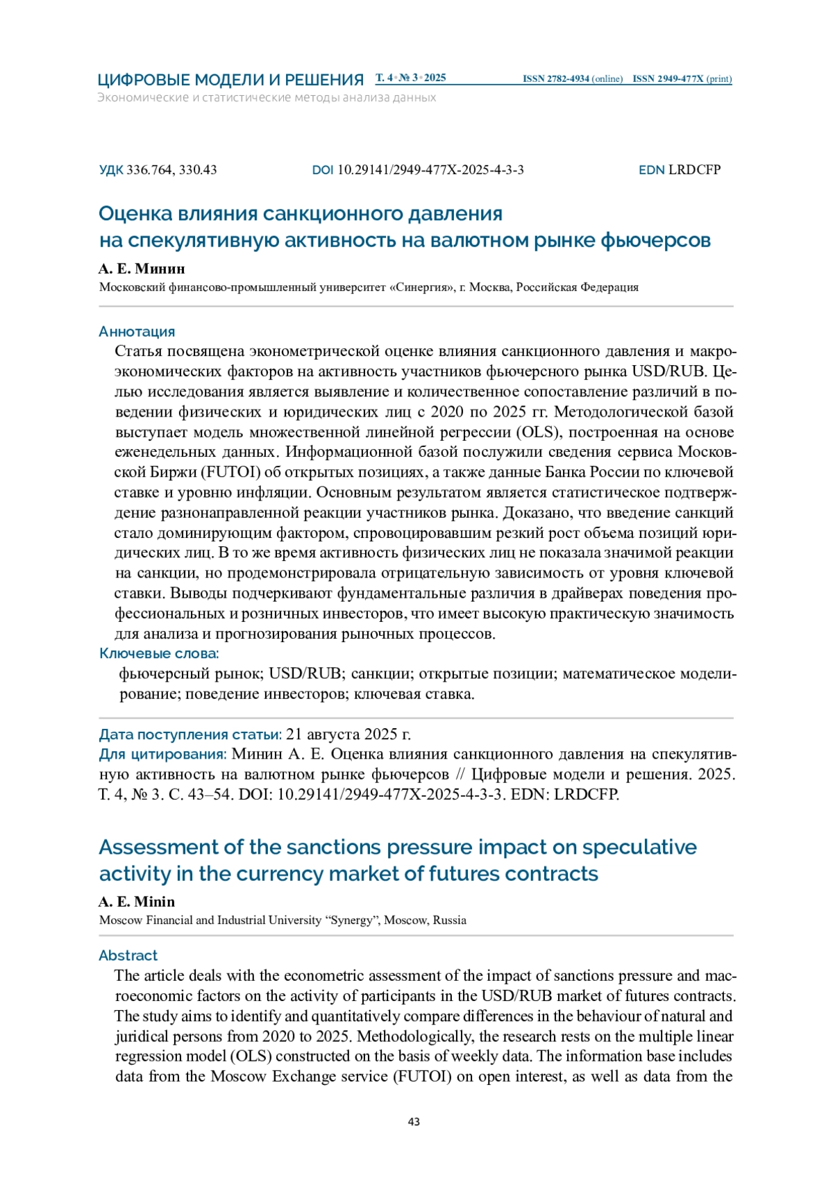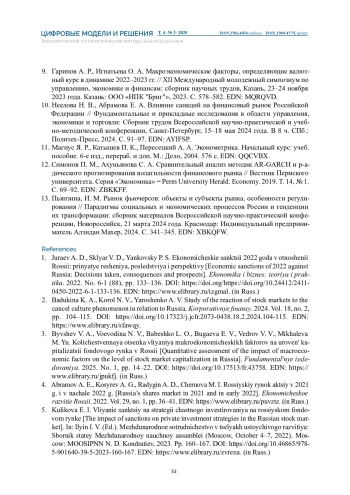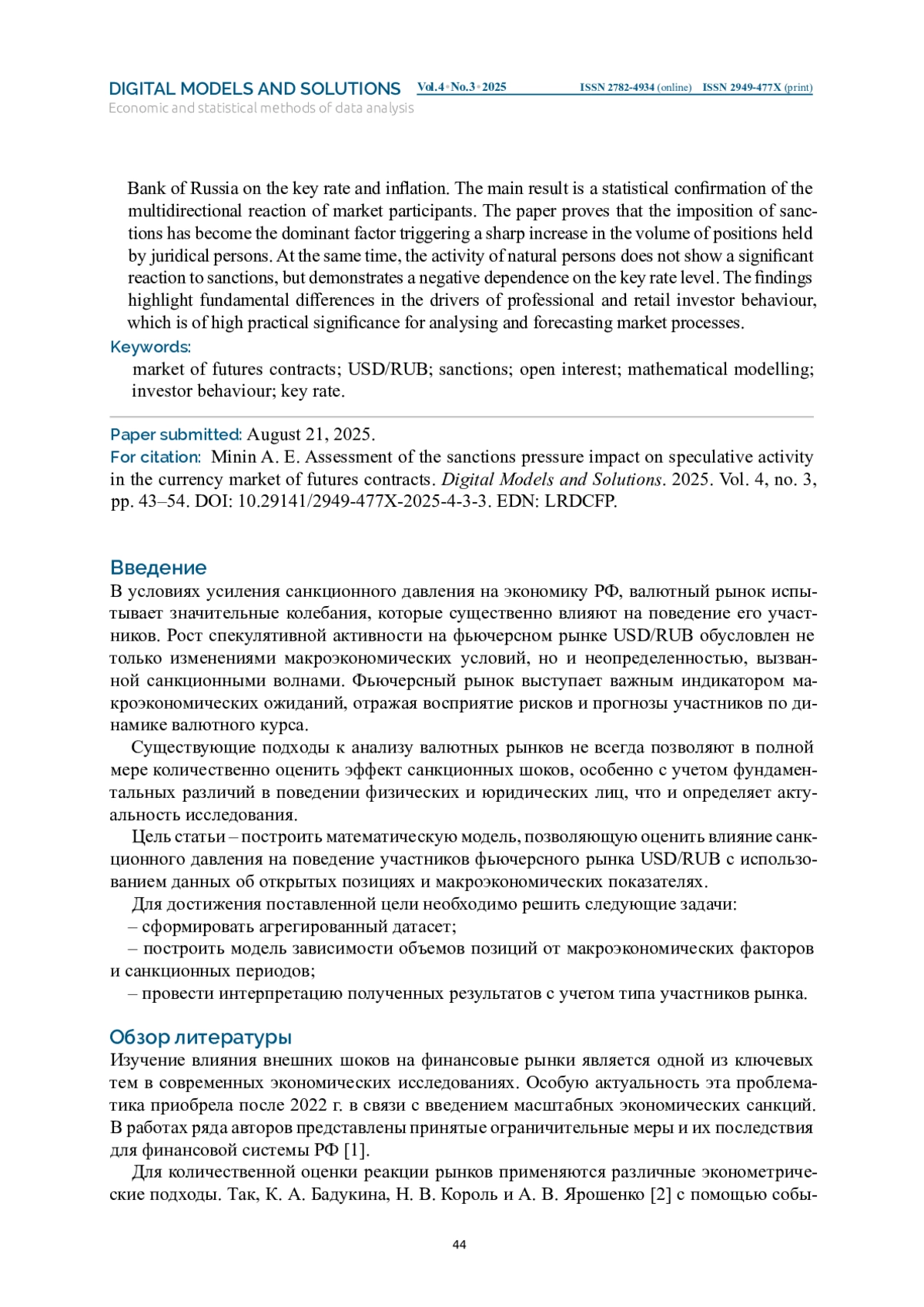 МИНИН А. Е. ОЦЕНКА ВЛИЯНИЯ САНКЦИОННОГО ДАВЛЕНИЯ НА СПЕКУЛЯТИВНУЮ АКТИВНОСТЬ НА ВАЛЮТНОМ РЫНКЕ ФЬЮЧЕРСОВ // ЦИФРОВЫЕ МОДЕЛИ И РЕШЕНИЯ. 2025. Т. 4 № 3