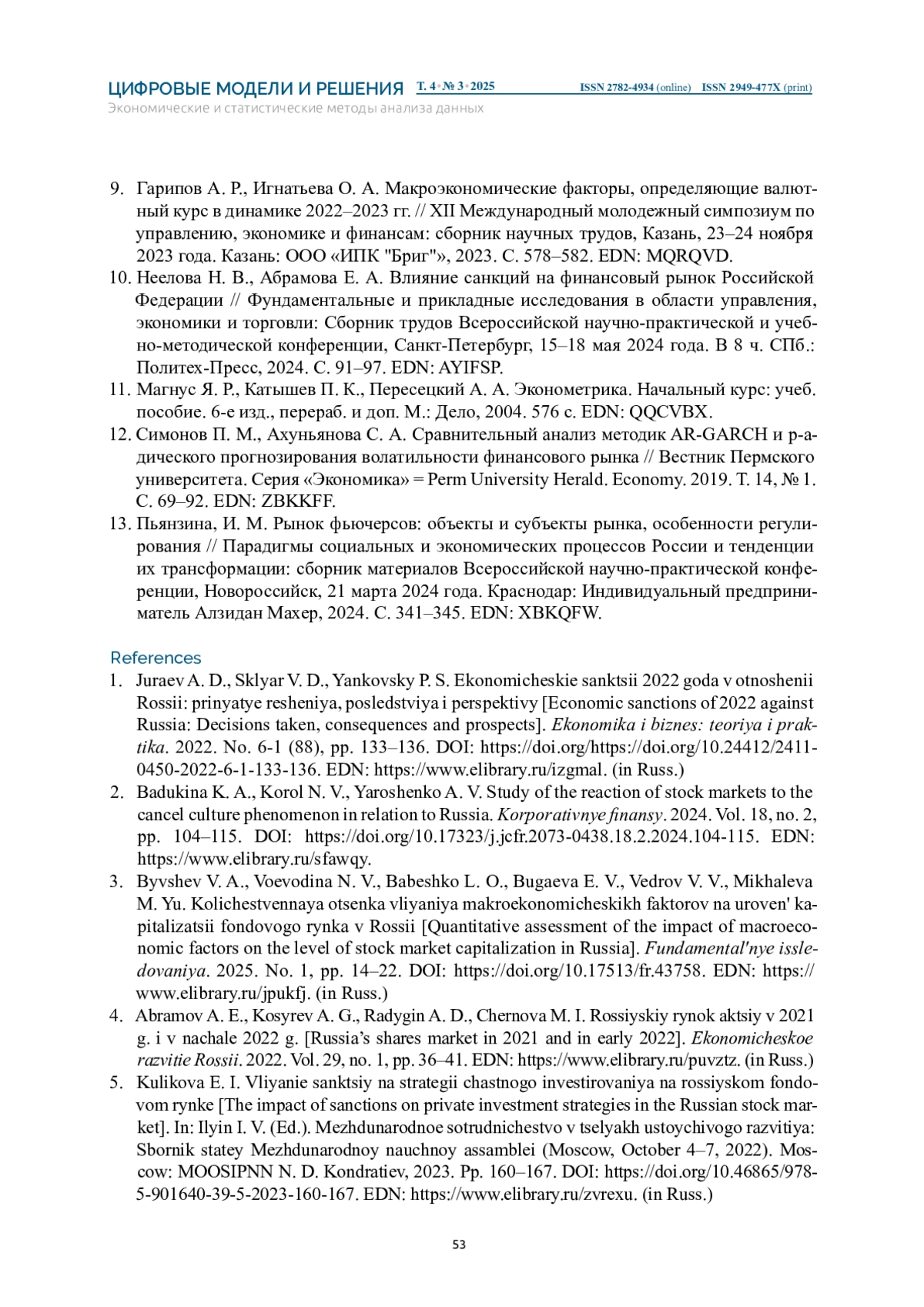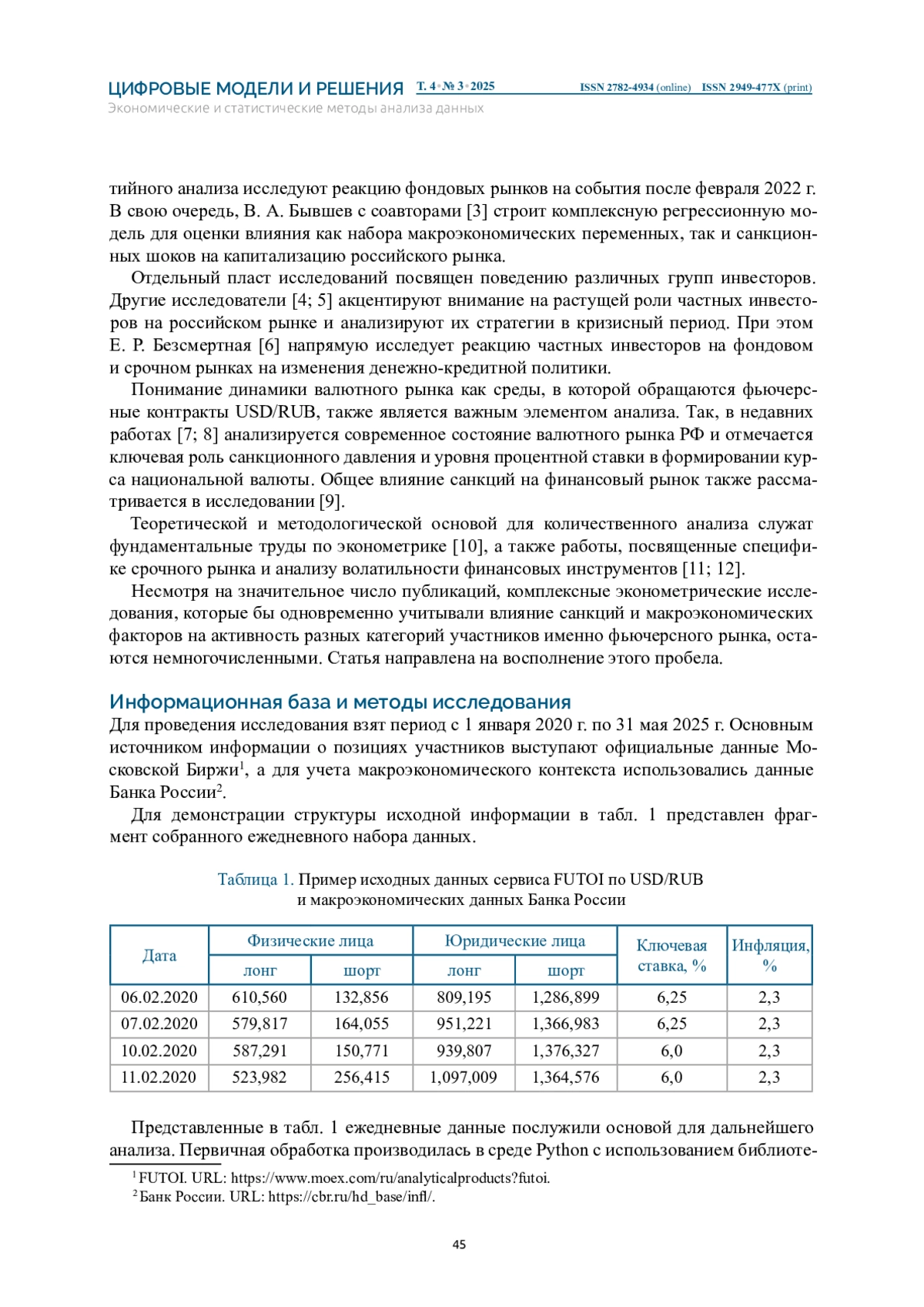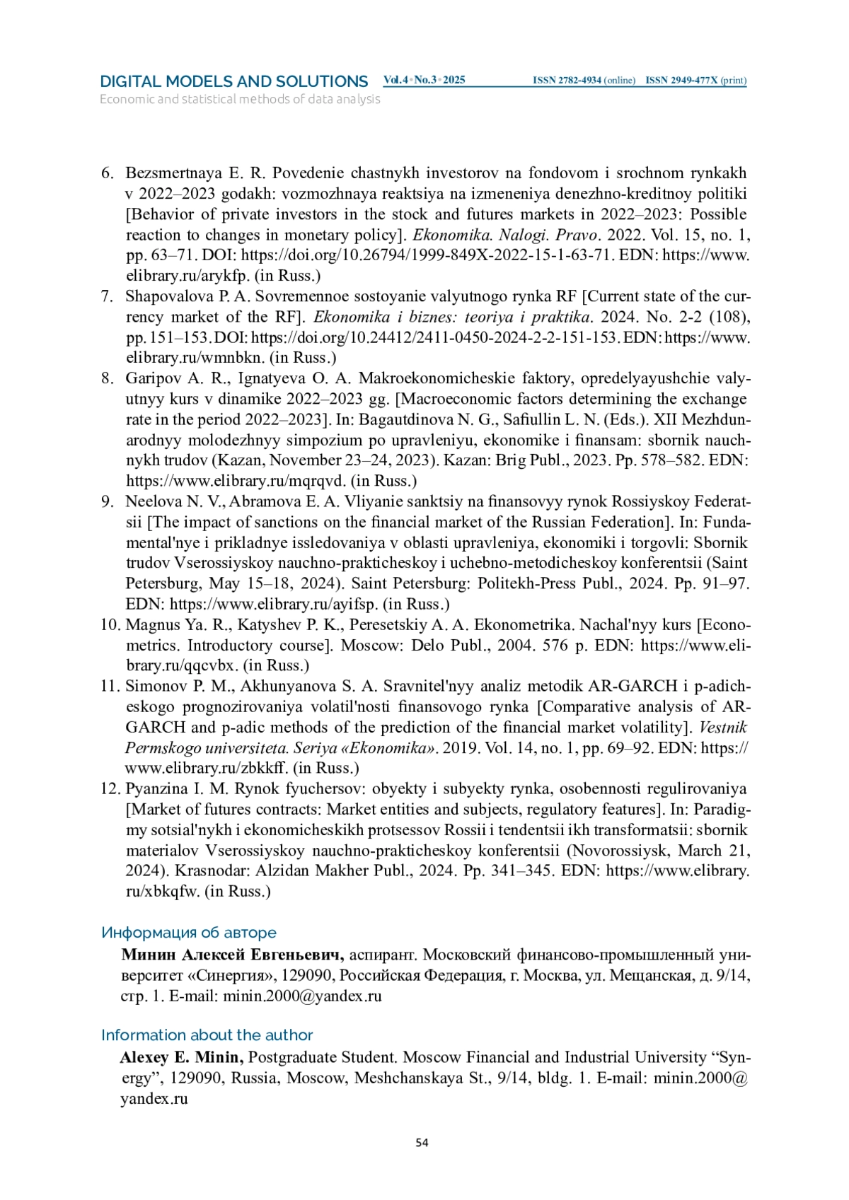 МИНИН А. Е. ОЦЕНКА ВЛИЯНИЯ САНКЦИОННОГО ДАВЛЕНИЯ НА СПЕКУЛЯТИВНУЮ АКТИВНОСТЬ НА ВАЛЮТНОМ РЫНКЕ ФЬЮЧЕРСОВ // ЦИФРОВЫЕ МОДЕЛИ И РЕШЕНИЯ. 2025. Т. 4 № 3