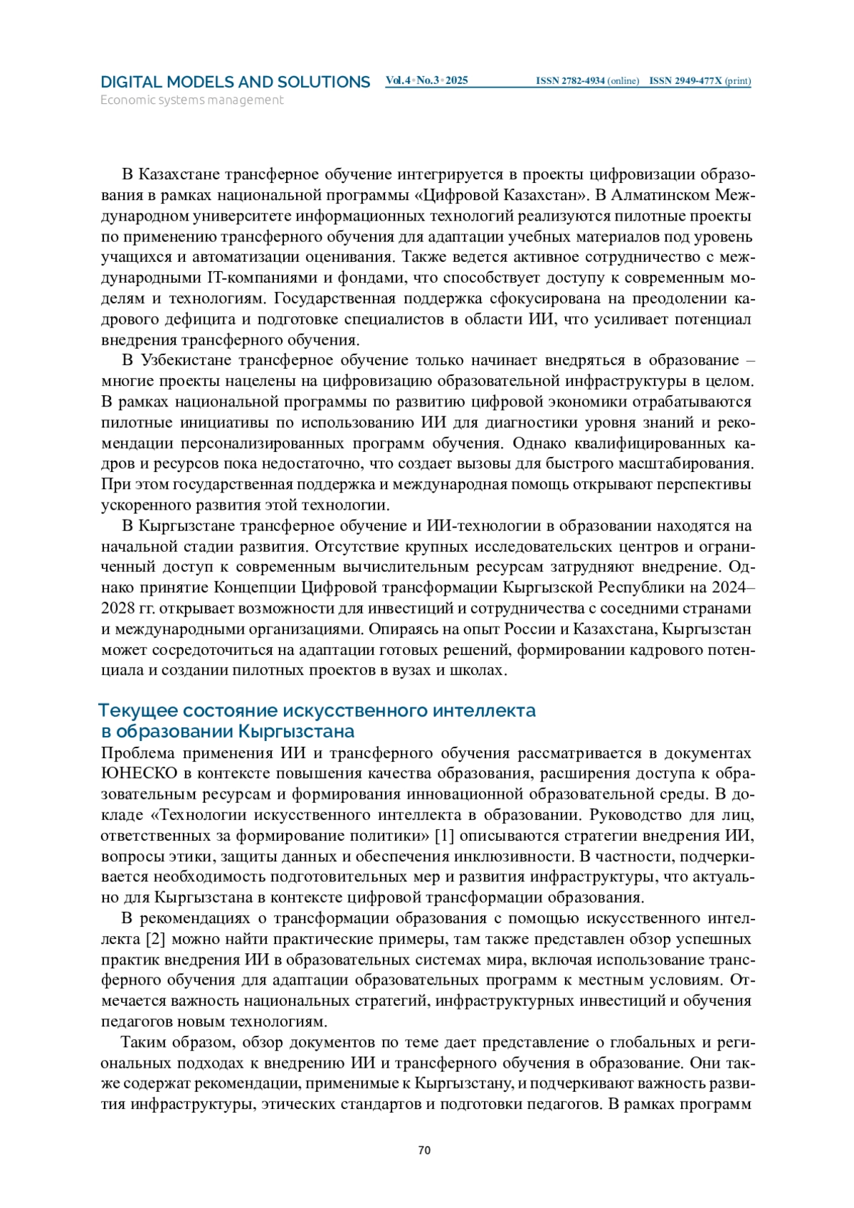 В статье исследуются современные методы применения искусственного интеллекта (ИИ) в системе образования Кыргызстана. Особое внимание уделено потенциалу технологий ИИ, в частности трансферного обучения как одного из наиболее эффективных методов, для персонализации учебного процесса, автоматизации оценки знаний и повышения его общей эффективности. Целью работы является анализ возможностей и разработка практических рекомендаций по интеграции данных технологий. Методы исследования включают сравнительный анализ международного опыта, анкетирование участников образовательного процесса и педагогический эксперимент. Результаты подтверждают, что применение инструментов ИИ способствует повышению качества образования. Делается вывод о необходимости комплексного внедрения инноваций для развития кадрового потенциала страны.