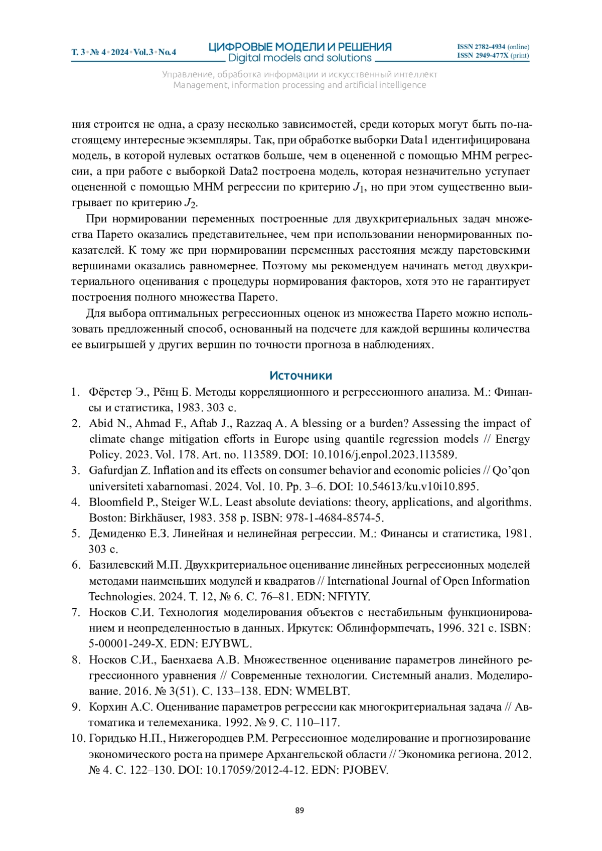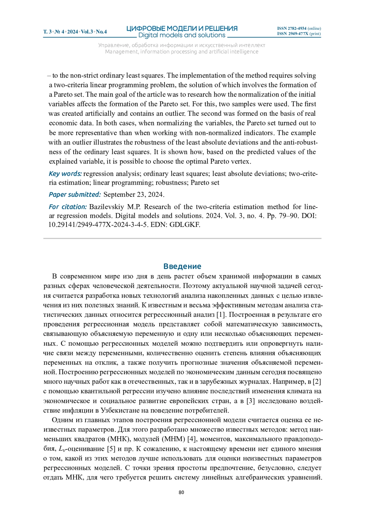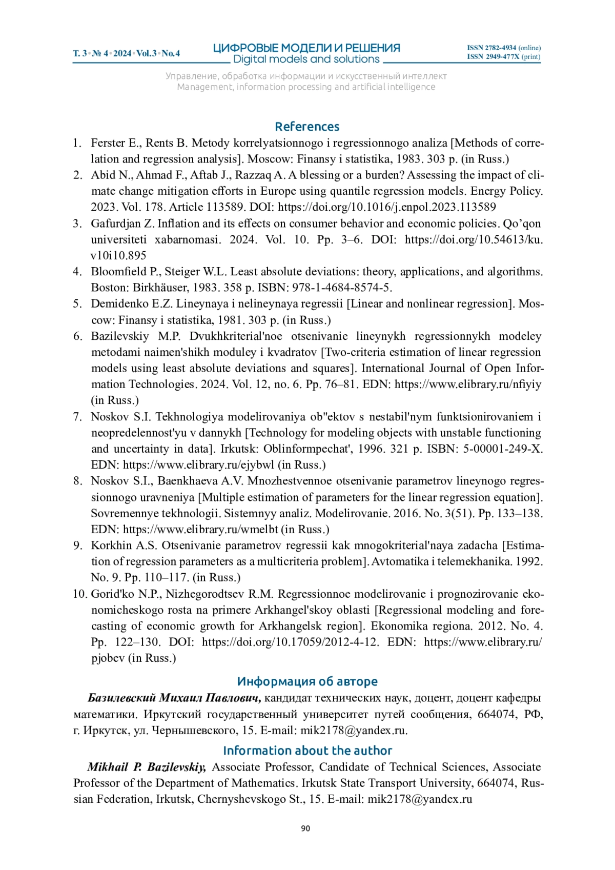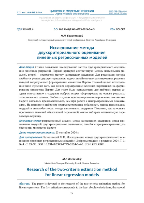 БАЗИЛЕВСКИЙ М. П. ИССЛЕДОВАНИЕ МЕТОДА ДВУХКРИТЕРИАЛЬНОГО ОЦЕНИВАНИЯ ЛИНЕЙНЫХ РЕГРЕССИОННЫХ МОДЕЛЕЙ // ЦИФРОВЫЕ МОДЕЛИ И РЕШЕНИЯ. 2024. Т. 3 № 4