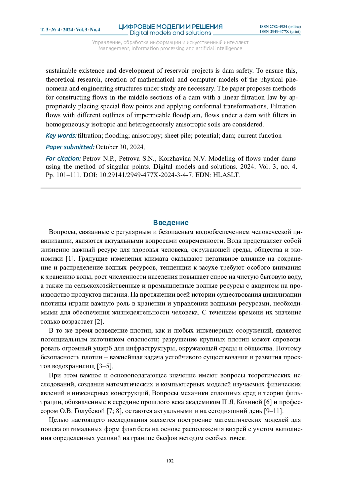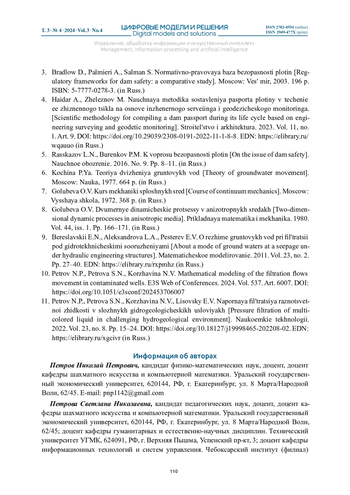 10. Petrov N.P., Petrova S.N., Korzhavina N.V. Mathematical modeling of the filtration flows movement in contaminated wells // E3S Web of Conferences. 2024. Vol. 537. Art. 6007. DOI: 10.1051/e3sconf/202453706007 EDN: CPBNNF