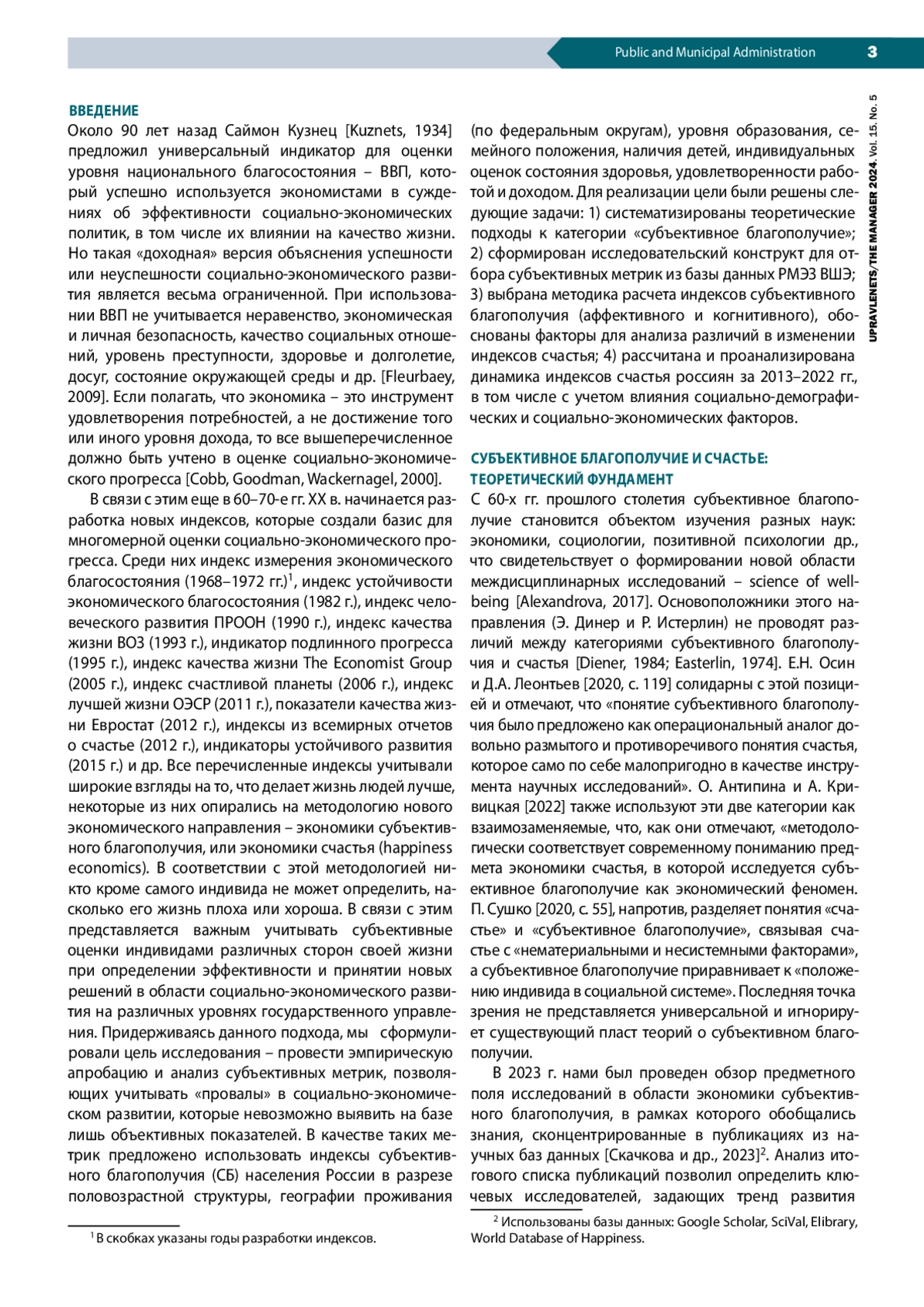 Многомерность и динамичность современной общественной жизни требуют модификации принципов измерения успешности социально-экономической политики. Статья посвящена эмпирической апробации и анализу субъективных метрик, позволяющих учитывать «провалы» в социально-экономическом развитии, которые невозможно выявить лишь на основе объективных показателей. Такими метриками выступают индексы субъективного благополучия населения России в разрезе половозрастной структуры, географии проживания (по федеральным округам), уровня образования, семейного положения, наличия детей, индивидуальных оценок состояния здоровья, удовлетворенности работой и доходом. Методологическую основу исследования составила теория субъективного благополучия Э. Динера. В работе использовались индексный метод и методы описательной статистики, включая представление многомерного частотного распределения двух признаков. Информационной базой выступили панельные данные Российского мониторинга социально-экономического положения и состояния здоровья населения ВШЭ за 2013–2022 гг. Результаты исследования показали, что наименьшее значение индекса удовлетворенности жизнью наблюдалось в 2016 г., а максимальное – в 2022 г. Значение аффективного индекса счастья оказалось выше по сравнению с уровнем когнитивной оценки своей жизни. Выявлено, что пол, возраст, регион проживания, уровень образования, а также удовлетворенность здоровьем, работой, оплатой труда и материальным положением влияют на значение и динамику индексов счастья россиян. Развитие подхода к измерению благополучия населения, учитывающего не только объективные показатели, но и субъективные оценки индивидами своей жизни и отдельных ее аспектов, позволяет идентифицировать лакуны в системе социально-экономической поддержки населения
