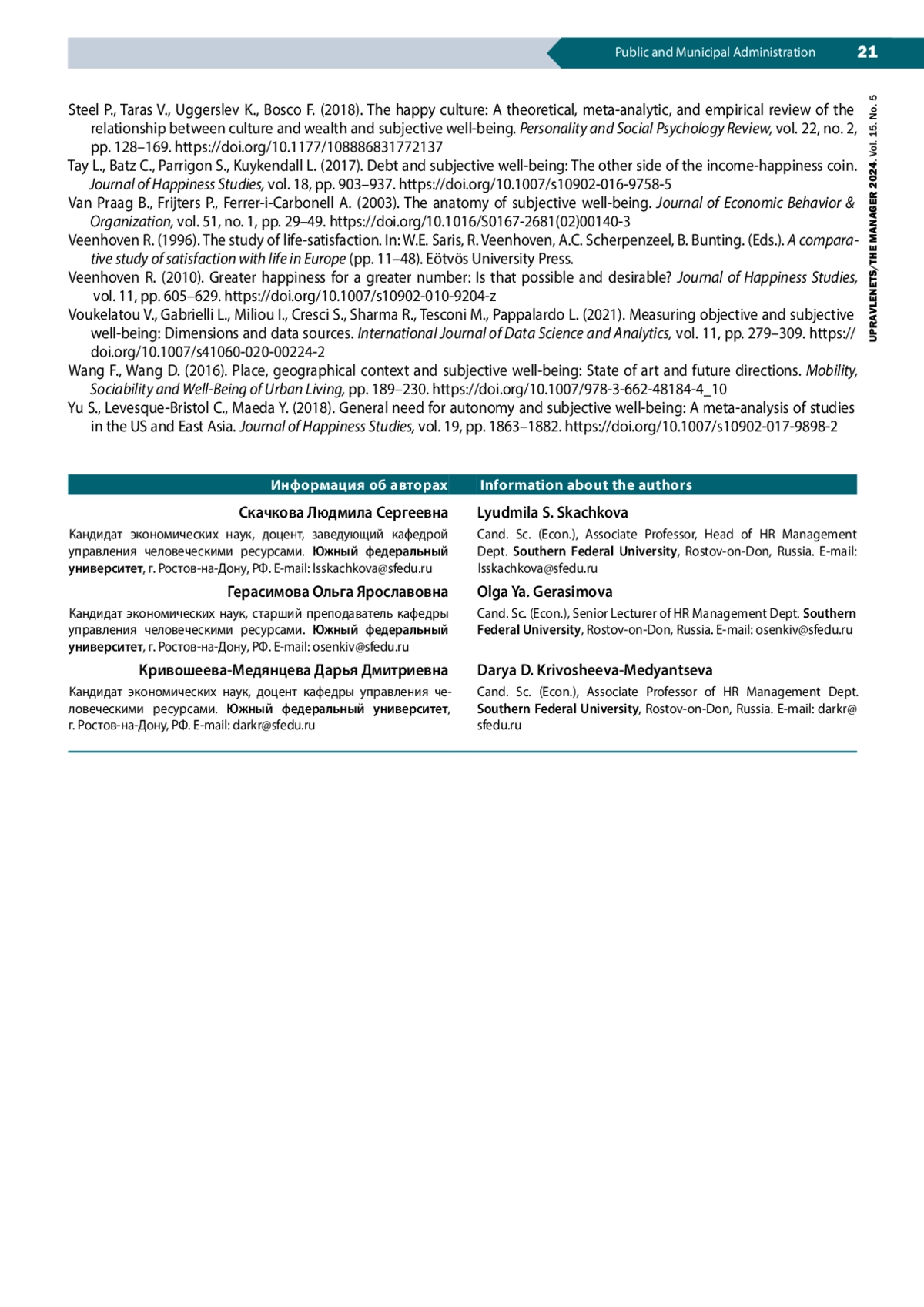 12. Широканова А.А. (2020). Тренды субъективного благополучия в России: 1998-2018 // Вестник Санкт-Петербургского университета. Социология. Т. 13, вып. 1. С. 4-24. DOI: 10.21638/spbu12.2020.101 EDN: JXMNDE