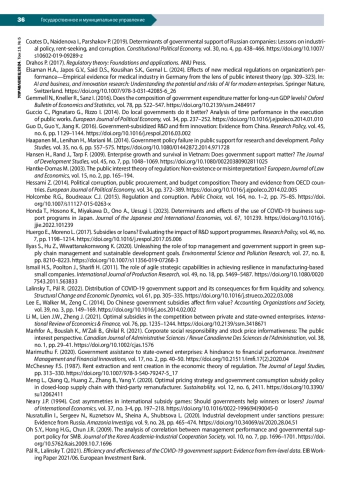 26. Coates D., Naidenova I., Parshakov P. (2019). Determinants of governmental support of Russian companies: Lessons on industrial policy, rent-seeking, and corruption. Constitutional Political Economy, vol. 30, no. 4, pp. 438-466. DOI: 10.1007/s10602-019-09289-z EDN: UYFCRZ