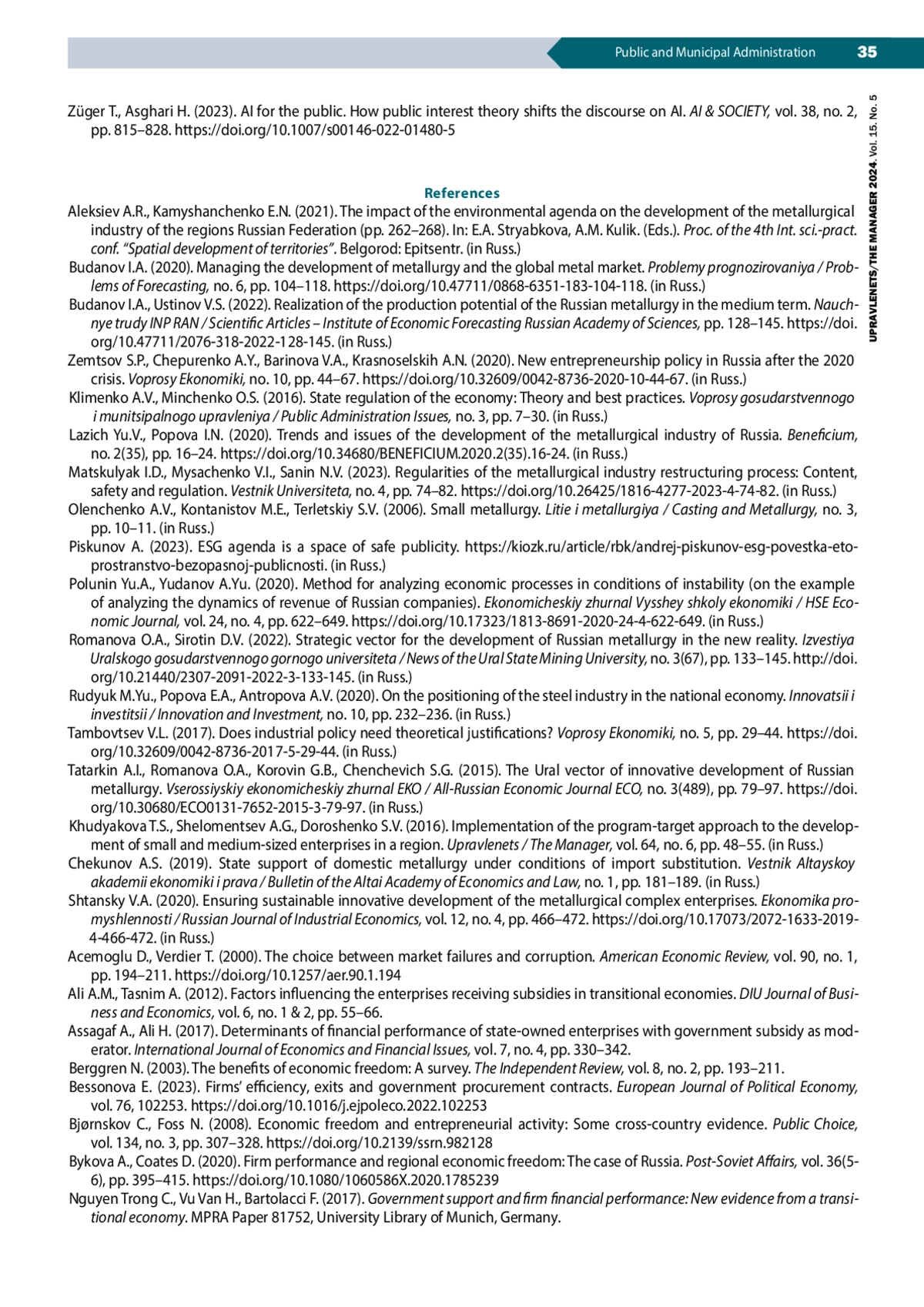 7. Мацкуляк И.Д., Мысаченко В.И., Санин Н.В. (2023). Закономерности процесса реструктуризации металлургической промышленности: содержание, безопасность и регулирование // Вестник университета. № 4. С. 74-82. DOI: 10.26425/1816-4277-2023-4-74-82 EDN: SDLUVW