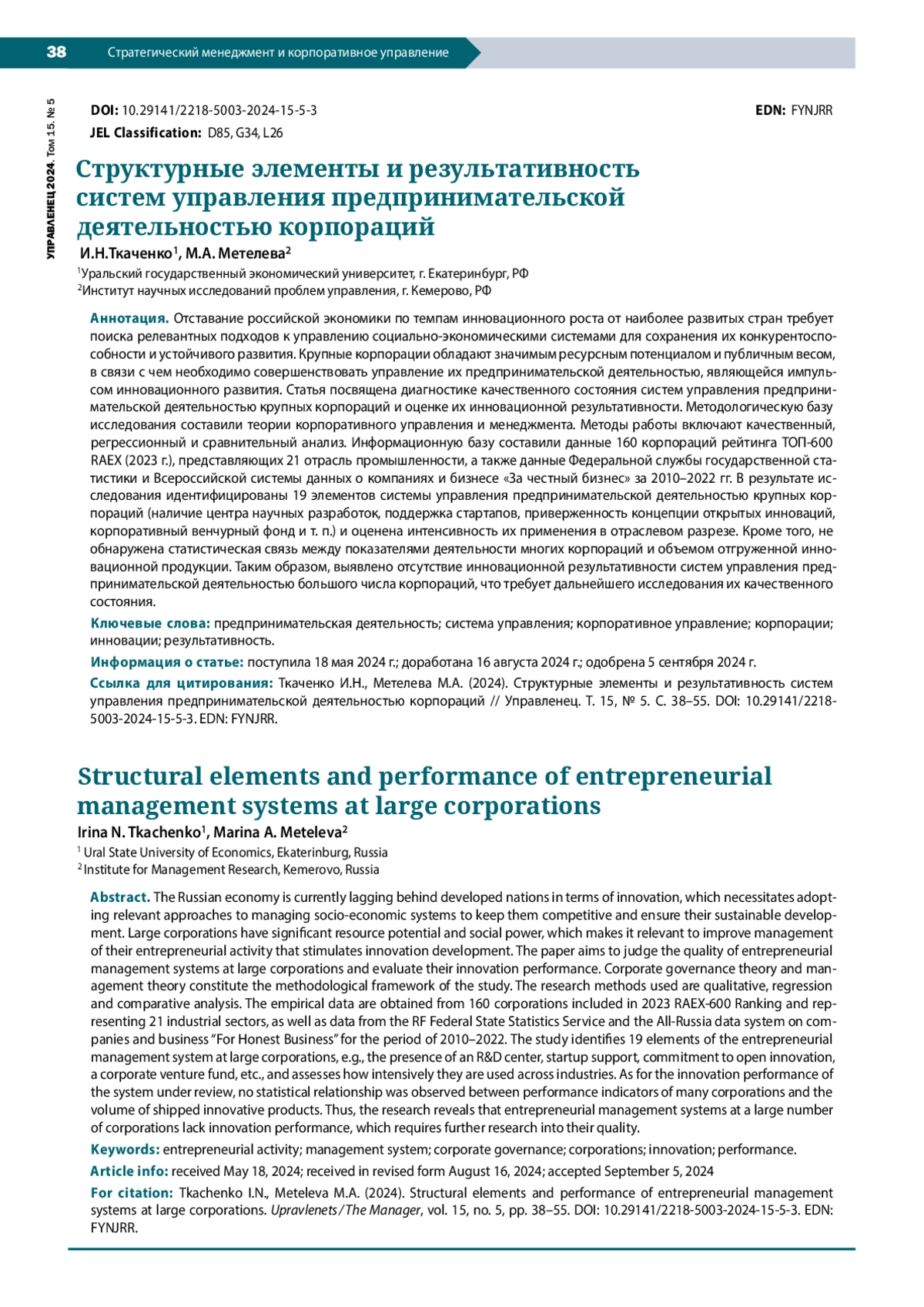 Отставание российской экономики по темпам инновационного роста от наиболее развитых стран требует поиска релевантных подходов к управлению социально-экономическими системами для сохранения их конкурентоспособности и устойчивого развития. Крупные корпорации обладают значимым ресурсным потенциалом и публичным весом, в связи с чем необходимо совершенствовать управление их предпринимательской деятельностью, являющейся импульсом инновационного развития. Статья посвящена диагностике качественного состояния систем управления предпринимательской деятельностью крупных корпораций и оценке их инновационной результативности. Методологическую базу исследования составили теории корпоративного управления и менеджмента. Методы работы включают качественный, регрессионный и сравнительный анализ. Информационную базу составили данные 160 корпораций рейтинга ТОП-600 RAEX (2023 г.), представляющих 21 отрасль промышленности, а также данные Федеральной службы государственной статистики и Всероссийской системы данных о компаниях и бизнесе «За честный бизнес» за 2010–2022 гг. В результате исследования идентифицированы 19 элементов системы управления предпринимательской деятельностью крупных корпораций (наличие центра научных разработок, поддержка стартапов, приверженность концепции открытых инноваций, корпоративный венчурный фонд и т. п.) и оценена интенсивность их применения в отраслевом разрезе. Кроме того, не обнаружена статистическая связь между показателями деятельности многих корпораций и объемом отгруженной инновационной продукции. Таким образом, выявлено отсутствие инновационной результативности систем управления предпринимательской деятельностью большого числа корпораций, что требует дальнейшего исследования их качественного состояния