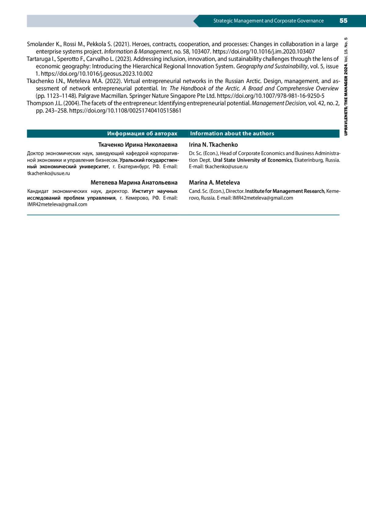 34. Tkachenko I.N., Metelevа M.A. (2022). Virtual entrepreneurial networks in the Russian Arctic. Design, management, and assessment of network entrepreneurial potential. In: The Handbook of the Arctic. A Broad and Comprehensive Overview (pp. 1123-1148). Palgrave Macmillan. Springer Nature Singapore Pte Ltd. DOI: 10.1007/978-981-16-9250-5