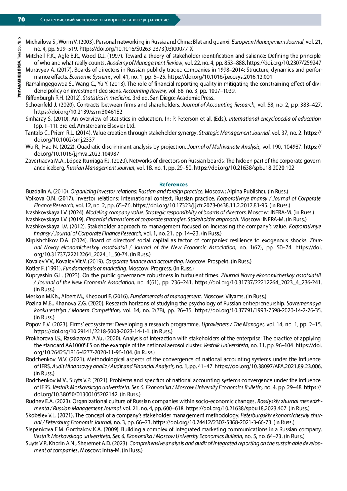 5. Ивашковская И.В. (2012). Стейкхолдерский подход к управлению, ориентированному на приращение стоимости компании // Корпоративные финансы. Т. 1, № 21. С. 14-23. EDN: OZZHEJ