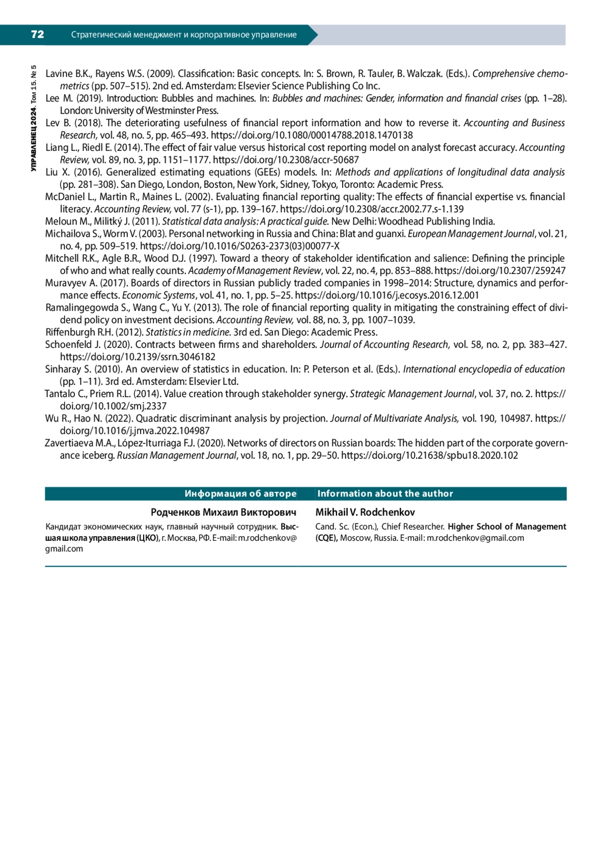 62. Zavertiaeva M.A., López-Iturriaga F.J. (2020). Networks of directors on Russian boards: The hidden part of the corporate governance iceberg. Russian Management Journal, vol. 18, no. 1, pp. 29-50. DOI: 10.21638/spbu18.2020.102 EDN: XQUXAF
