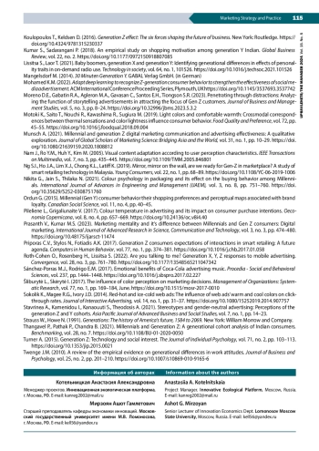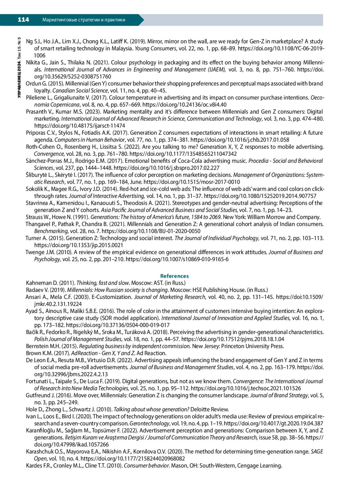 37. Thangavel P., Pathak P., Chandra B. (2021). Millennials and Generation Z: A generational cohort analysis of Indian consumers. Benchmarking, vol. 28, no. 7. DOI: 10.1108/BIJ-01-2020-0050 EDN: LCTIAD