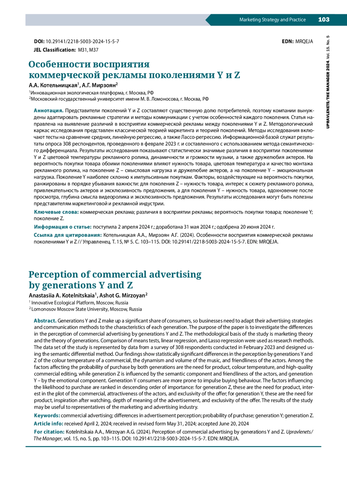 Представители поколений Y и Z составляют существенную долю потребителей, поэтому компании вынуждены адаптировать рекламные стратегии и методы коммуникации с учетом особенностей каждого поколения. Статья направлена на выявление различий в восприятии коммерческой рекламы между поколениями Y и Z. Методологический каркас исследования представлен классической теорией маркетинга и теорией поколений. Методы исследования включают тесты на сравнение средних, линейную регрессию, а также Лассо-регрессию. Информационной базой служат результаты опроса 308 респондентов, проведенного в феврале 2023 г. и составленного с использованием метода семантического дифференциала. Результаты исследования показывают статистически значимые различия в восприятии поколениями Y и Z цветовой температуры рекламного ролика, динамичности и громкости музыки, а также дружелюбия актеров. На вероятность покупки товара обоими поколениями влияют нужность товара, цветовая температура и качество монтажа рекламного ролика, на поколение Z – смысловая нагрузка и дружелюбие актеров, а на поколение Y – эмоциональная нагрузка. Поколение Y наиболее склонно к импульсивным покупкам. Факторы, воздействующие на вероятность покупки, ранжированы в порядке убывания важности: для поколения Z – нужность товара, интерес к сюжету рекламного ролика, привлекательность актеров и эксклюзивность предложения, а для поколения Y – нужность товара, вдохновение после просмотра, глубина смысла видеоролика и эксклюзивность предложения. Результаты исследования могут быть полезны представителям маркетинговой и рекламной индустрии
