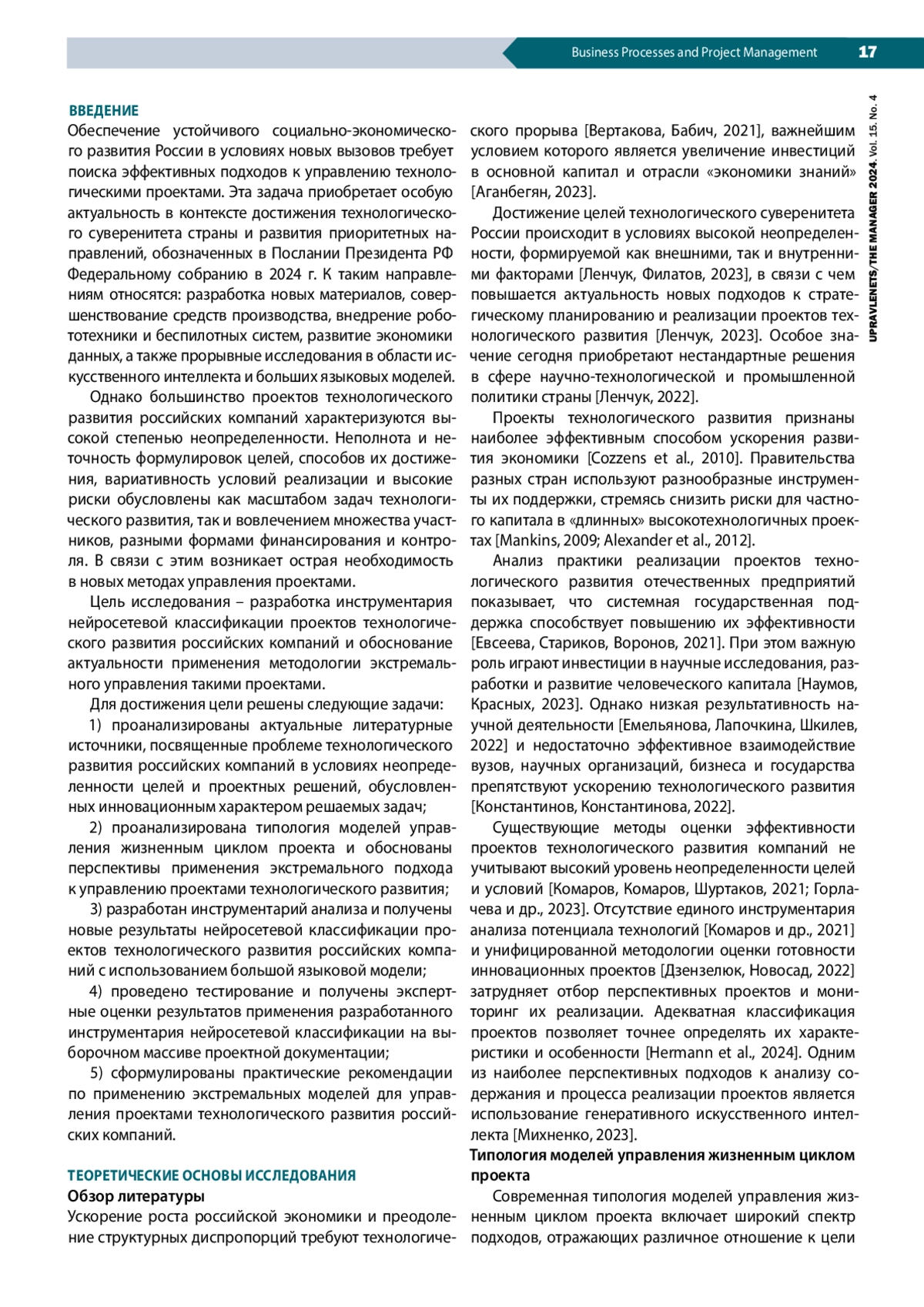 Обеспечение устойчивого социально-экономического развития России в условиях новых вызовов требует поиска эффективных подходов к управлению технологическими проектами. Эта задача приобретает особую актуальность в контексте достижения технологического суверенитета страны и развития приоритетных направлений, обозначенных в Послании Президента РФ Федеральному собранию в 2024 г. К таким направлениям относятся: разработка новых материалов, совершенствование средств производства, внедрение робототехники и беспилотных систем, развитие экономики данных, а также прорывные исследования в области искусственного интеллекта и больших языковых моделей