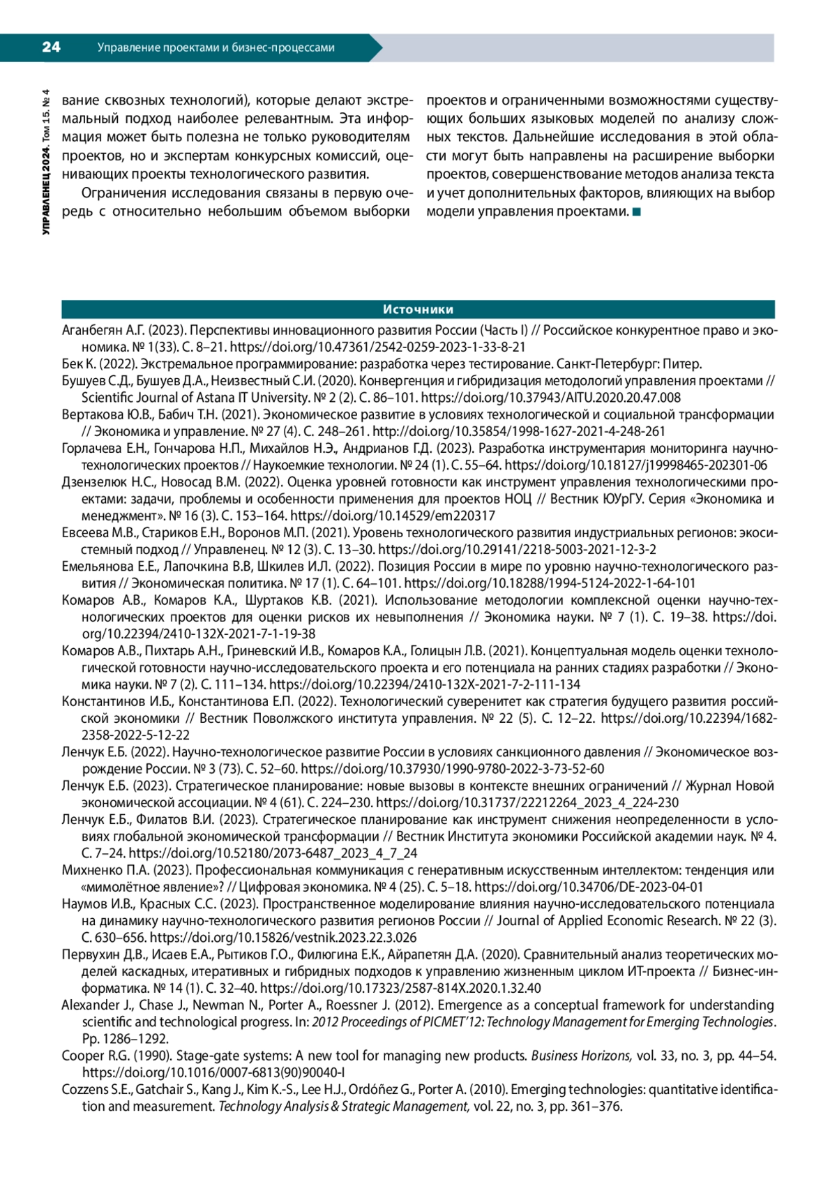 1. Аганбегян А.Г. (2023). Перспективы инновационного развития России (Часть I) // Российское конкурентное право и экономика. № 1(33). С. 8-21. DOI: 10.47361/2542-0259-2023-1-33-8-21 EDN: CZBNEF