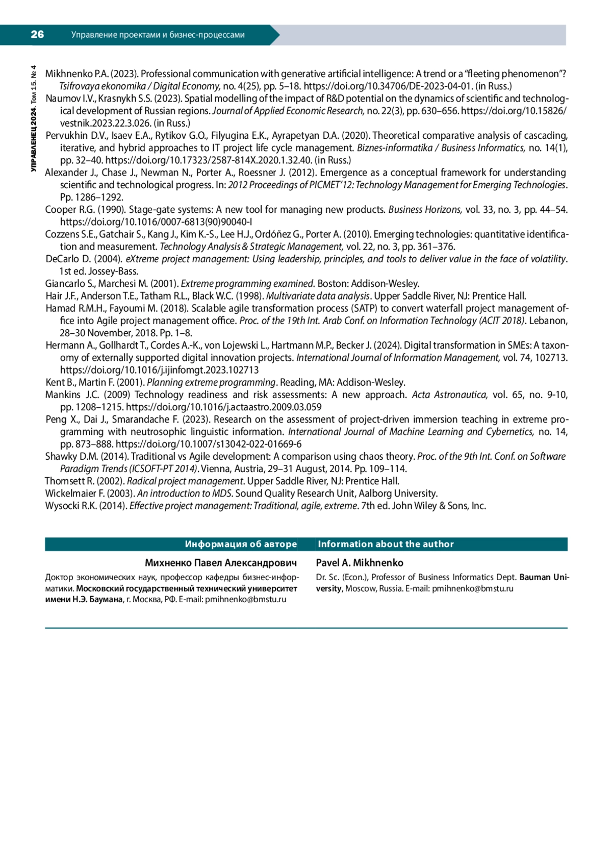 3. Бушуев С.Д., Бушуев Д.А., Неизвестный С.И. (2020). Конвергенция и гибридизация методологий управления проектами // Scientific Journal of Astana IT University. № 2 (2). С. 86-101. DOI: 10.37943/AITU.2020.20.47.008 EDN: JWJZVZ