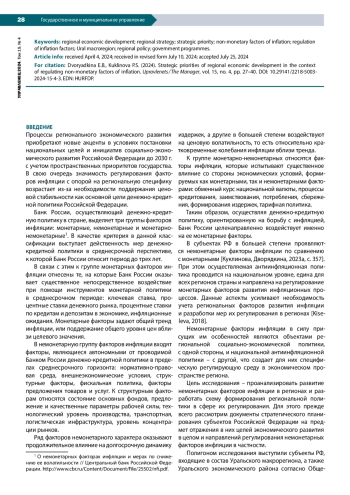 Процессы регионального экономического развития приобретают новые акценты в условиях постановки национальных целей и инициатив социально-экономического развития Российской Федерации до 2030 г. с учетом пространственных приоритетов государства. В свою очередь значимость регулирования факторов инфляции с опорой на региональную специфику возрастает из-за необходимости поддержания ценовой стабильности как основной цели денежно-кредитной политики Российской Федерации