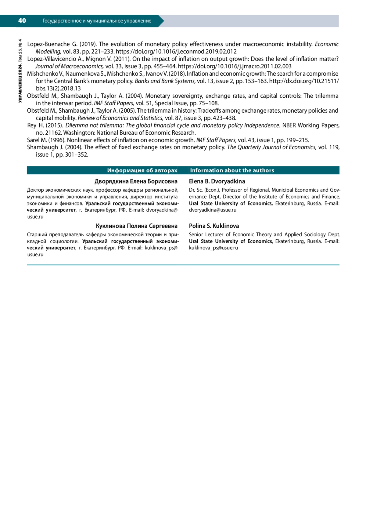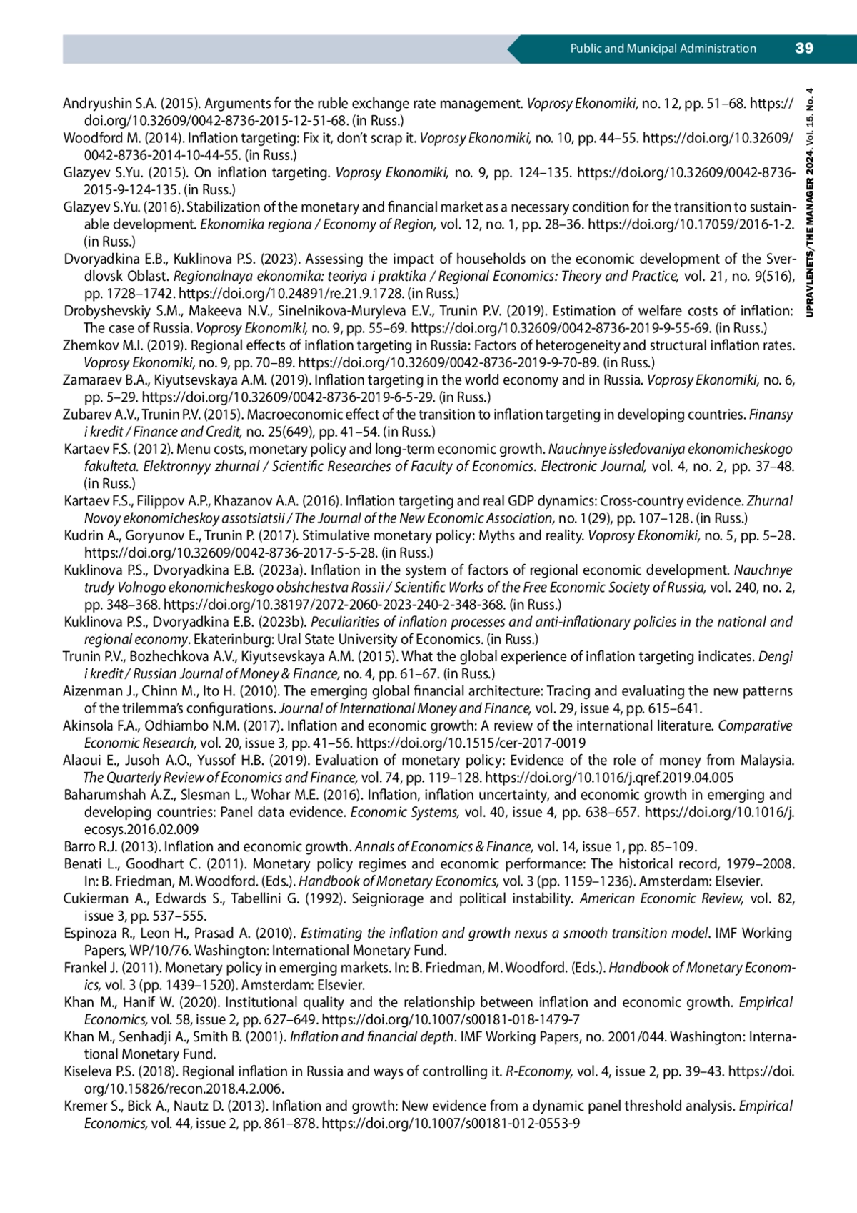 14. Куклинова П.С., Дворядкина Е.Б. (2023а). Инфляция в системе факторов регионального экономического развития // Научные труды Вольного экономического общества России. Т. 240, № 2. С. 348-368. DOI: 10.38197/2072-2060-2023-240-2-348-368 EDN: ULULEL