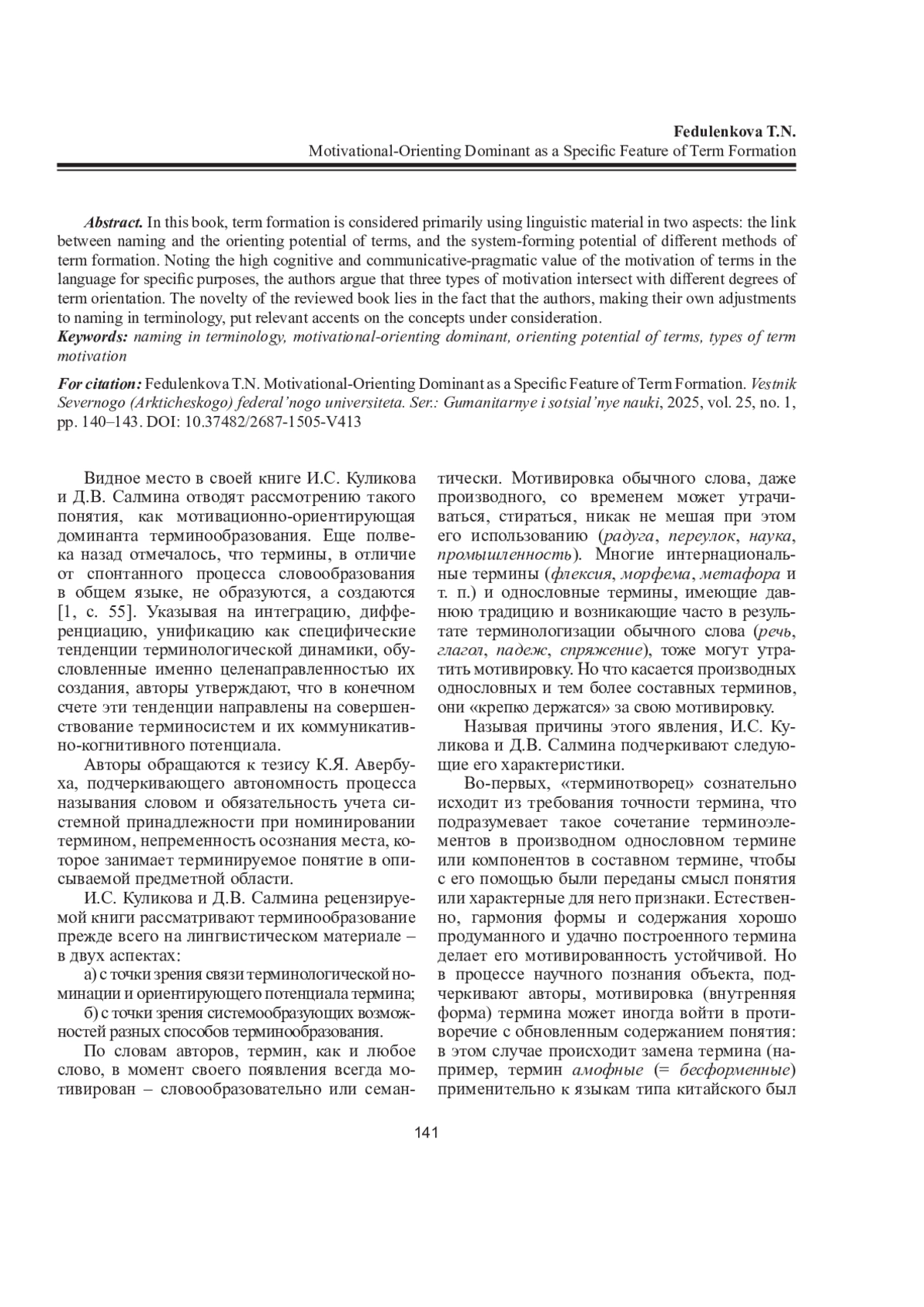 Видное место в своей книге И. С. Куликова и Д. В. Салмина отводят рассмотрению такого понятия, как мотивационно-ориентирующая доминанта терминообразования. Еще полвека назад отмечалось, что термины, в отличие от спонтанного процесса словообразования в общем языке, не образуются, а создаются [1, с. 55]. Указывая на интеграцию, дифференциацию, унификацию как специфические тенденции терминологической динамики, обу- словленные именно целенаправленностью их создания, авторы утверждают, что в конечном счете эти тенденции направлены на совершенствование терминосистем и их коммуникативно-когнитивного потенциала.