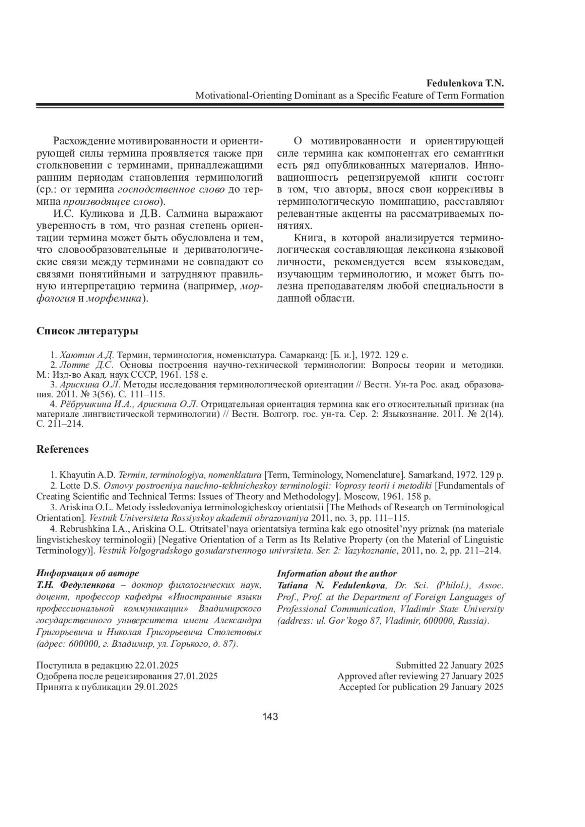 4. Рёбрушкина И.А., Арискина О.Л. Отрицательная ориентация термина как его относительный признак (на материале лингвистической терминологии) // Вестн. Волгогр. гос. ун-та. Сер. 2: Языкознание. 2011. No 2 (14). С. 211-214.