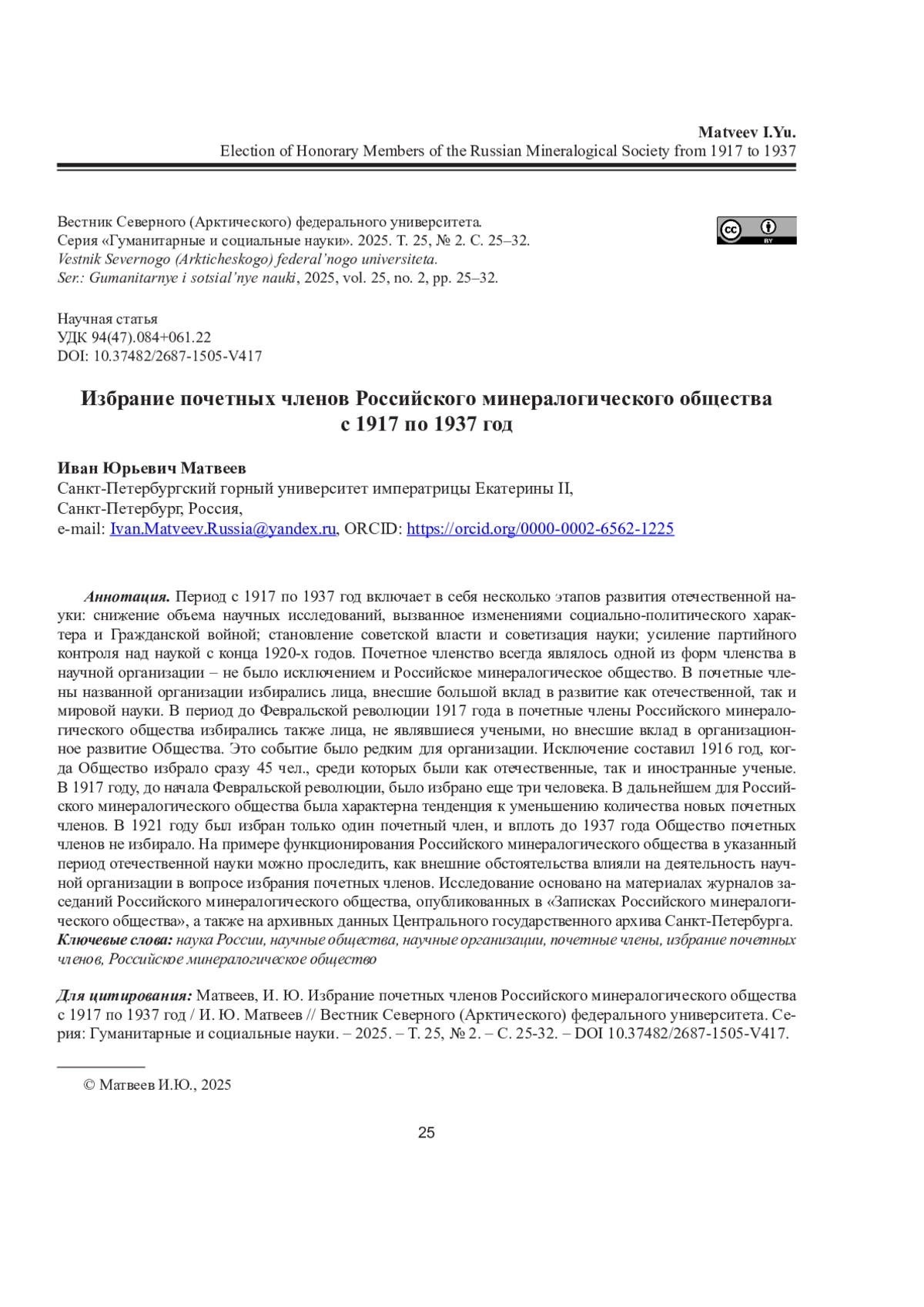 Период с 1917 по 1937 год включает в себя несколько этапов развития отечественной науки: снижение объема научных исследований, вызванное изменениями социально-политического характера и Гражданской войной; становление советской власти и советизация науки; усиление партийного контроля над наукой с конца 1920-х годов. Почетное членство всегда являлось одной из форм членства в научной организации - не было исключением и Российское минералогическое общество. В почетные члены названной организации избирались лица, внесшие большой вклад в развитие как отечественной, так и мировой науки. В период до Февральской революции 1917 года в почетные члены Российского минералогического общества избирались также лица, не являвшиеся учеными, но внесшие вклад в организационное развитие Общества. Это событие было редким для организации. Исключение составил 1916 год, когда Общество избрало сразу 45 чел., среди которых были как отечественные, так и иностранные ученые. В 1917 году, до начала Февральской революции, было избрано еще три человека. В дальнейшем для Российского минералогического общества была характерна тенденция к уменьшению количества новых почетных членов. В 1921 году был избран только один почетный член, и вплоть до 1937 года Общество почетных членов не избирало. На примере функционирования Российского минералогического общества в указанный период отечественной науки можно проследить, как внешние обстоятельства влияли на деятельность научной организации в вопросе избрания почетных членов. Исследование основано на материалах журналов заседаний Российского минералогического общества, опубликованных в «Записках Российского минералогического общества», а также на архивных данных Центрального государственного архива Санкт-Петербурга.