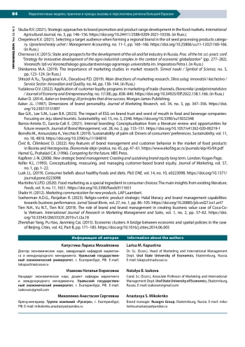15. Скуба Р.В. (2021). Стратегические подходы продвижения бренда и развития ассортимента на рынках продовольственных товаров // International Agricultural Journal. № 3. С. 146-156. DOI: 10.24411/2588-0209-2021-10336 EDN: AWXYCE