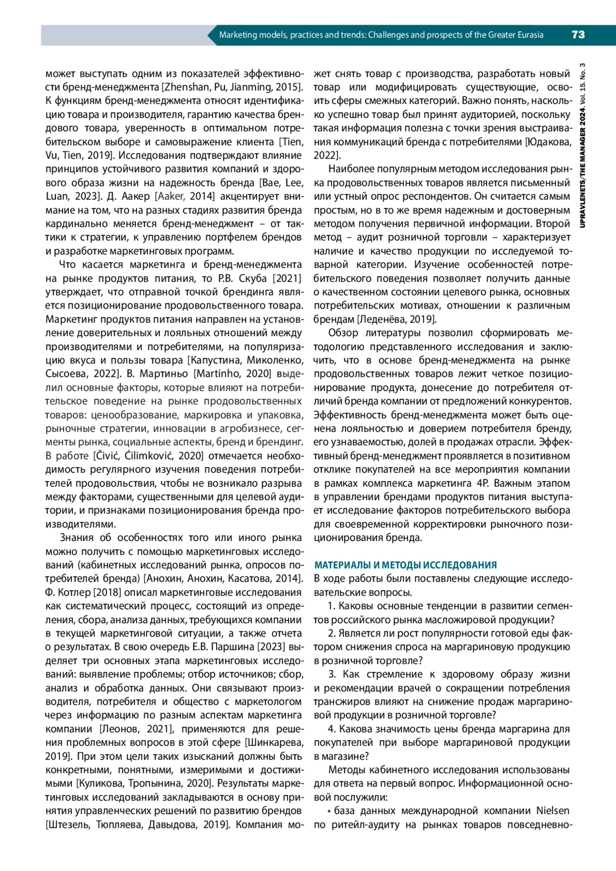 На российском рынке маргариновой продукции наблюдаются изменения моделей потребительского поведения, отрасль столкнулась с падением продаж ряда брендов. Исследование направлено на выявление новых трендов на рынке масложировой продукции и проверку гипотез о сокращении потребления маргарина конечными потребителями по причине популярности здорового образа жизни, быстро растущего спроса на готовую еду и выпечку, высокой чувствительности покупателей к цене. Методологическую основу исследования составили теории бренд-менеджмента и маркетинга. Использованы методы кабинетного и полевого маркетинговых исследований, опрос, статистические методы анализа. Расчеты проведены с помощью статистического программного обеспечения SPSS и JASP. Для оценки брендменеджмента компаний применялись индекс лояльности бренду, показатель знания брендов в Яндекс Wordstat. Информационную базу работы составили панельные данные Nielsen по ритейл-аудиту на рынках товаров повседневного спроса за 2021–2023 гг., аналитической платформы QlickView, отчет ООО «Профи Исследования» по итогам полевого исследования брендов маргарина в ноябре 2023 г., материалы опроса, проведенного авторами в ноябре – декабре 2023 г. Получен вывод о сокращении доли маргарина в общем объеме производства и продаж твердых жиров. Подтвердились гипотезы об уменьшении покупок маргаринов из-за стремления к здоровому образу жизни и по рекомендации врача. Выявлено, что цена является ключевым фактором при выборе маргариновой продукции.