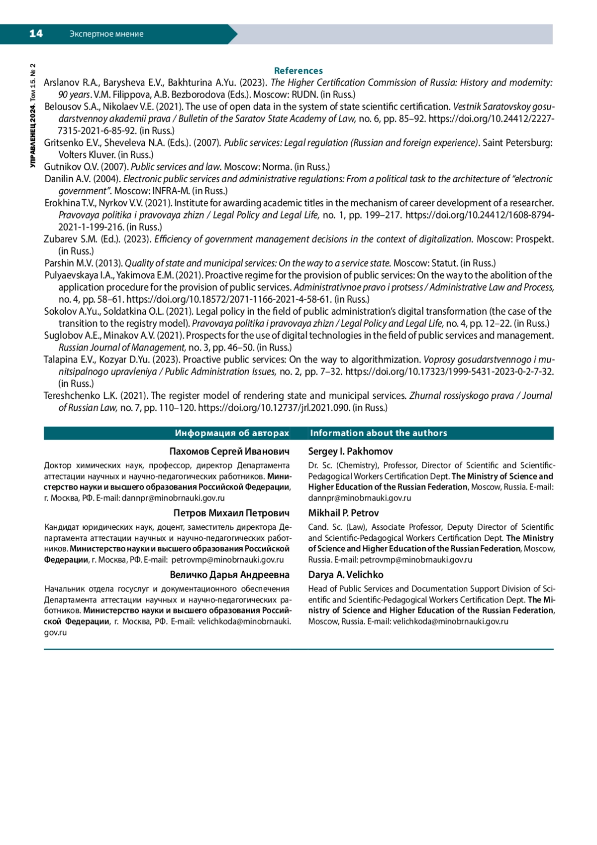 12. Талапина Э.В., Козяр Д.Ю. (2023). Проактивные государственные услуги: на пути к алгоритмизации // Вопросы государственного и муниципального управления. № 2. С. 7-32. DOI: 10.17323/1999-5431-2023-0-2-7-32 EDN: WHLQUP