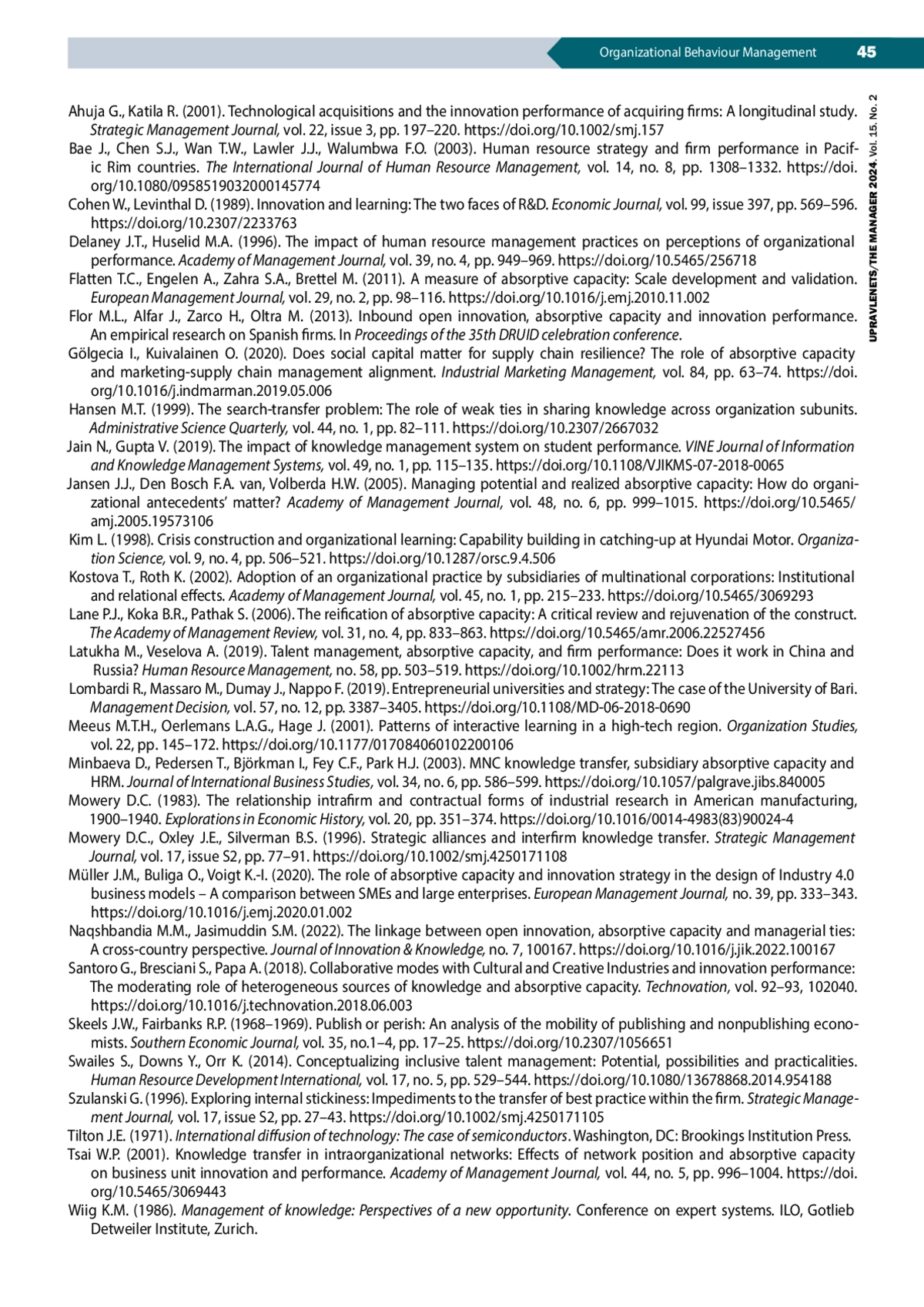 24. Lane P.J., Koka B.R., Pathak S. (2006). The reification of absorptive capacity: A critical review and rejuvenation of the construct. The Academy of Management Review, vol. 31, no. 4, pp. 833-863. DOI: 10.5465/amr.2006.22527456