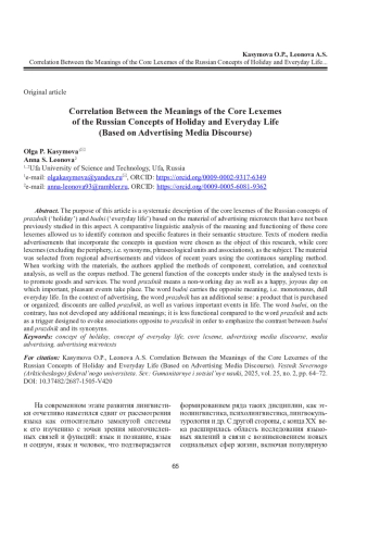 Целью статьи является системное описание ядерных лексем концептов «праздник» и «будни» на материале рекламных микротекстов, которые ранее не рассматривались в данном аспекте. Сравнительный лингвистический анализ значения и функционирования ядерных лексем позволил определить общее и специфическое в их семантической структуре. Объектом исследования стали тексты современных медиареклам, где используются указанные концепты, предметом - ядерные лексемы, без обращения к их периферии - синонимам, фразеологическим единицам и ассоциатам. Материал был отобран методом сплошной выборки из региональных объявлений и видеороликов последних лет. В ходе работы использовались методы компонентного, корреляционного и контекстного анализа, корпусный метод. Общая функция рассматриваемых концептов в анализируемых рекламных текстах заключается в продвижении товаров и услуг. Слово «праздник» означает нерабочий день, а также счастливый, радостный день, в котором происходят важные, приятные события. Слово «будни» имеет противоположное значение: это монотонная, повседневная, обыденная жизнь. В контексте рекламы слово «праздник» кроме основного значения приобретает добавочное: это товар, который покупается, организуется, праздником называют скидки, разные важные события в жизни. Слово «будни», в свою очередь, не развивает добавочного значения. Оно обладает меньшими функциональными возможностями в сравнении со словом «праздник», выступая в роли триггера, призванного вызывать противоположные празднику ассоциации, т. е. используется для подчеркивания контраста со словом «праздник» или синонимичными ему словами.