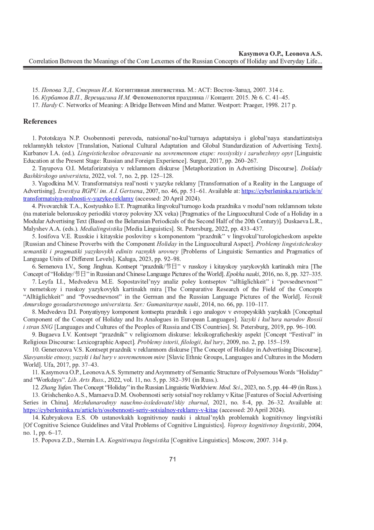 11. Касымова О.П., Леонова А.С. Симметрия и асимметрия семантической структуры многозначных слов “праздник” и “будни” // Рос. гуманит. журн. 2022. Т. 11, No 5. С. 382-389. EDN: DLCCFN