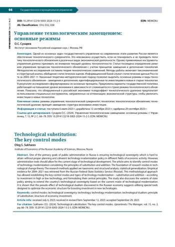 Одной из основных задач государственного управления на современном этапе развития России является обеспечение технологического суверенитета. Это невозможно осуществить, если не планировать и не проводить политику технологического обновления в различных видах экономической деятельности. Однако применяемые инструменты управления должны принимать во внимание текущий уровень технологичности. Статья посвящена определению режимов управления процессом технологического обновления с учетом принципов замещения и дополнения технологий. Методологию исследования составила теория технологических изменений. Методы работы включают таксономический и структурный анализ, обобщение статистических оценок. Информационной базой служат статистические данные Росстата за 2004–2021 гг. Указанный теоретико-методологический подход позволил выделить основные режимы и виды технологического обновления – замещения и дополнения, идентифицированные по инвестициям в новые и старые технологии. В результате исследования сформулированы их основные принципы. Предложены варианты государственной политики, работающей на повышение уровня экономики в зависимости от сложившегося в стране режима технологического обновления. Показано, что обнаруженный в российской экономике псевдоэффект технологического дуализма предполагает использование специальных инструментов, направленных на оптимизацию экономической структуры, чтобы увеличить инвестиции в новые технологии