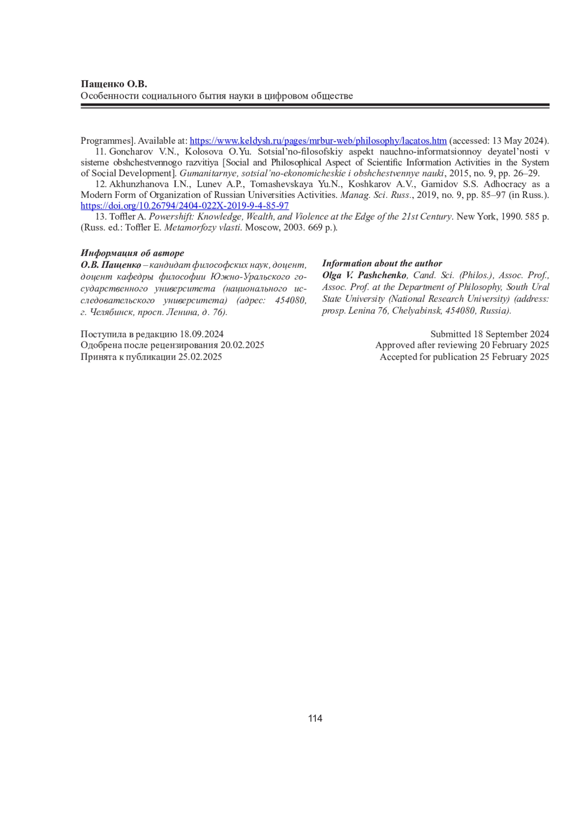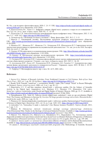 3. Шиповалова Л.В. О субъекте научной деятельности в цифровую эпоху // Социальные и цифровые исследования науки: коллектив. моногр. / под ред. А.А. Аргамаковой, Е.В. Масланова, В.В. Слюсарева, Т.М. Хусяинова. М.: Рус. о-во истории и философии науки, 2020. С. 23-37. URL: http://rshps.ru/books/social-and-digital-studies-of-science (2020).pdf (дата обращения: 19.07.2024).