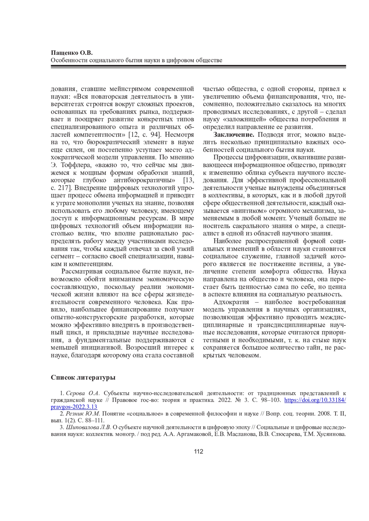 1. Серова О.А. Субъекты научно-исследовательской деятельности: от традиционных представлений к гражданской науке // Правовое гос-во: теория и практика. 2022. No 3. С. 98-103. DOI: 10.33184/pravgos-2022.3.13 EDN: HVPLLP