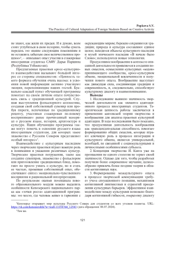 На государственном уровне привлечение иностранных студентов в регионы является важной задачей, способствует улучшению качества миграционного притока, повышению интереса к русскому языку и образованию в России. Этот процесс напрямую связан с необходимостью разработки и реализации региональных и вузовских стратегий адаптации иностранных студентов, которые способствовали бы их успешной интеграции в принимающее сообщество и включали решение проблем языкового барьера, обеспечение комфортного проживания, культурную интеграцию и адаптацию к условиям новой среды. Цель настоящего исследования – продемонстрировать возможности творческой деятельности как условия адаптационного процесса.