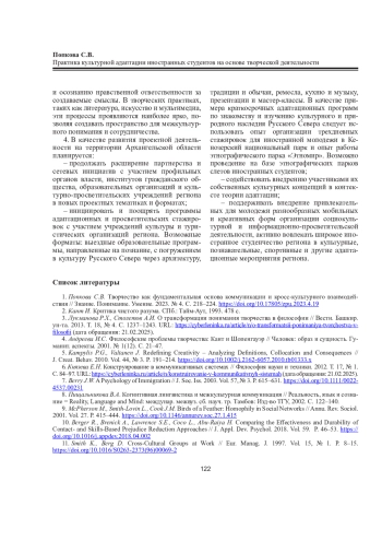 1. Попкова С.В. Творчество как фундаментальная основа коммуникации и кросс-культурного взаимодействия // Знание. Понимание. Умение. 2023. No 4. С. 218-224. DOI: 10.17805/zpu.2023.4.19