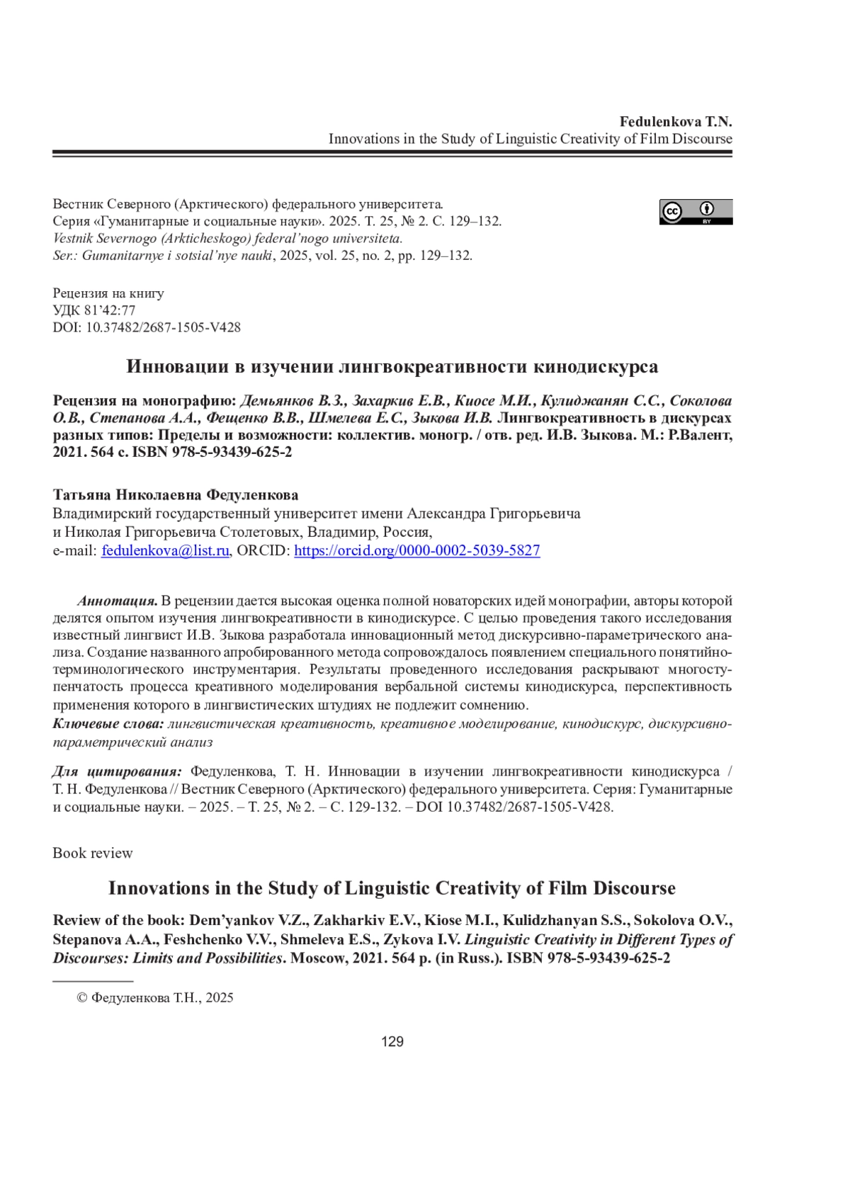 В рецензии дается высокая оценка полной новаторских идей монографии, авторы которой делятся опытом изучения лингвокреативности в кинодискурсе. С целью проведения такого исследования известный лингвист И. В. Зыкова разработала инновационный метод дискурсивно-параметрического анализа. Создание названного апробированного метода сопровождалось появлением специального понятийно-терминологического инструментария. Результаты проведенного исследования раскрывают многоступенчатость процесса креативного моделирования вербальной системы кинодискурса, перспективность применения которого в лингвистических штудиях не подлежит сомнению.