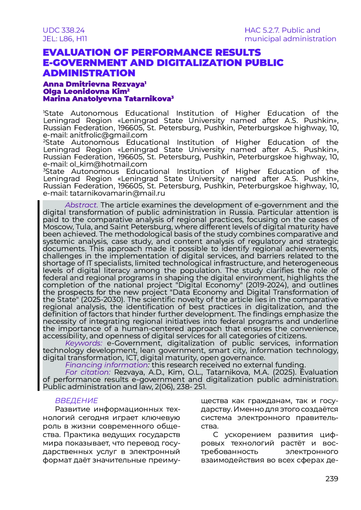 В статье рассматриваются процессы развития электронного правительства и цифровой трансформации государственного управления в России. Особое внимание уделено сравнительному анализу региональных практик, в частности опыта Москвы, Тулы и Санкт-Петербурга, где были достигнуты различные результаты в области цифровой зрелости. Методологическая основа исследования включает сравнительный и системный анализ, метод кейс-стади, а также контент-анализ нормативно-правовой базы и стратегических документов. Такой подход позволил выявить достижения регионов, проблемы внедрения цифровых сервисов, а также барьеры, связанные с дефицитом ИТ-специалистов, ограниченной инфраструктурой и неоднородным уровнем цифровой грамотности населения. В работе уточнена роль федеральных и региональных программ в формировании цифровой среды, показано завершение национального проекта «Цифровая экономика» (2019-2024 гг.) и обозначены перспективы реализации нового проекта «Экономика данных и цифровая трансформация государства» (2025-2030 гг.). Научная новизна статьи заключается в сопоставительном региональном анализе, выявлении лучших практик цифровизации и определении факторов, препятствующих дальнейшему развитию. Сделан вывод о необходимости интеграции региональных инициатив в федеральные программы, а также о значении человекоцентричного подхода, предполагающего удобство, доступность и открытость цифровых сервисов для всех категорий граждан.