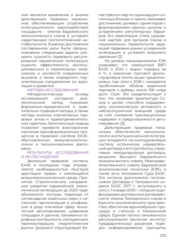 Современная динамика международных отношений характеризуется нарастанием санкционного давления, фрагментацией глобальных цепочек поставок и усложнением торгово-экономических связей. В этих условиях региональные интеграционные объединения, обладая собственными правовыми и институциональными механизмами координации, становятся ключевыми площадками для поддержания устойчивости и экономического роста. Евразийский экономический союз (ЕАЭС), правовой фундамент которого заложен Договором от 29 мая 2014 г., демонстрирует институциональную эволюцию от модели координации отдельных политик к формированию целостной системы союзного права и правоприменения. Базовые принципы свободы движения товаров, услуг, капитала и рабочей силы, закреплённые в договоре, наполняются отраслевым содержанием через многочисленные решения органов Союза и судебную практику Суда ЕАЭС, что позволяет адаптировать интеграционную конструкцию к внешним вызовам и обеспечивать предсказуемость для экономических акторов внутри общего рынка [1].