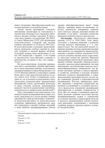 Образование играет одну из важнейших ролей в развитии экономики, науки и культуры. Особое место в образовательной системе занимает высшее образование. Сегодня без подготовки высококвалифицированных специалистов нельзя представить поступательное и динамичное развитие общества. Отдельно стоит отметить университеты как высшие учебные заведения, по-прежнему имеющие высокий статус. В статье предпринята попытка найти ответ на вопрос, почему университетское образование до сих пор является центральным ядром системы российского высшего образования. Для этого автор обратился к изучению опыта советской высшей школы. В СССР в 1959-1969 годах происходили серьезные преобразования. Особую роль в модернизации высшего образования играли университеты. На основе как опубликованных, так и архивных, впервые вводимых в научный оборот материалов автор проанализировал нормативно-правовую базу, регулирующую систему высшего образования в СССР, определил основные этапы политики партийных и государственных органов власти в сфере университетского образования. В результате проведенного исследования автор пришел к выводу, что в конце 1950-х годов и на протяжении 1960-х основными направлениями работы партийных и государственных органов власти были: совершенствование системы управления высшим образованием; укрепление связи высшей школы с производством и создание практико-ориентированной системы образования; подготовка кадров для поступления в аспирантуру. Таким образом, руководство партии и правительства осознавало, что университетское образование в СССР не было безупречным, существовали серьезные проблемы, которые тормозили его развитие, а вместе с ним и всю систему высшего образования в стране. Директивные органы понимали значимость совершенствования университетов как центров подготовки высококвалифицированных кадров в гуманитарной, естественно-научной, технической областях.