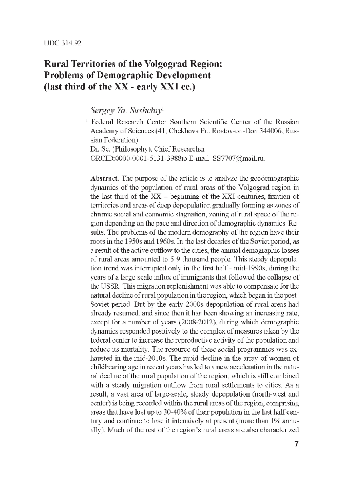 15. Сущий С.Я. Этнодемографический потенциал Волгоградской области - современное состояние и перспективы // Региональная экономика. Юг России. 2016. № 4. С. 41-56.