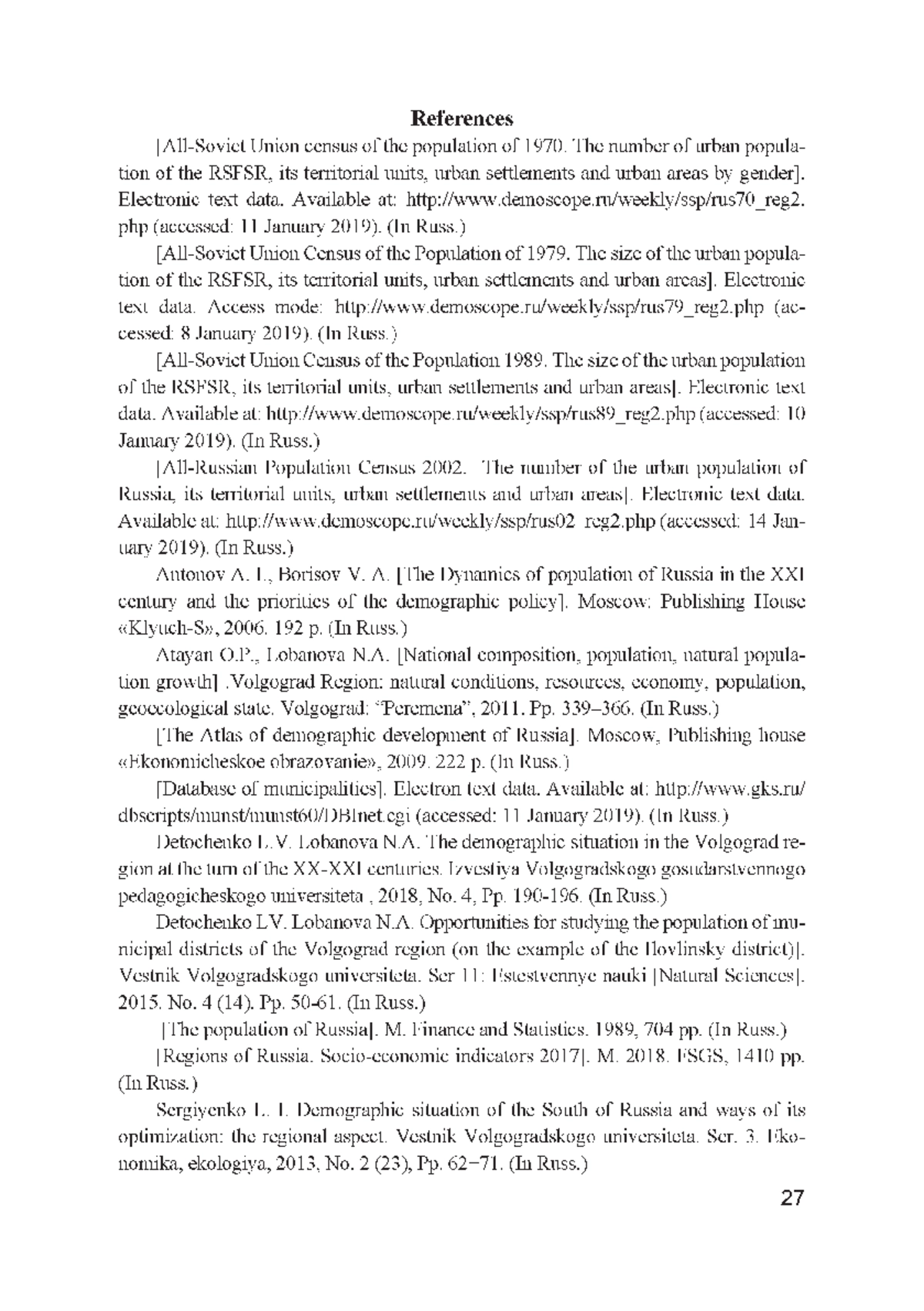 9. Деточенко Л.В., Лобанова Н.А. Демографическая ситуация в Волгоградской области на рубеже XX-XXI вв. // Известия Волгоградского государственного педагогического университета. 2018. №4. С. 190-196.