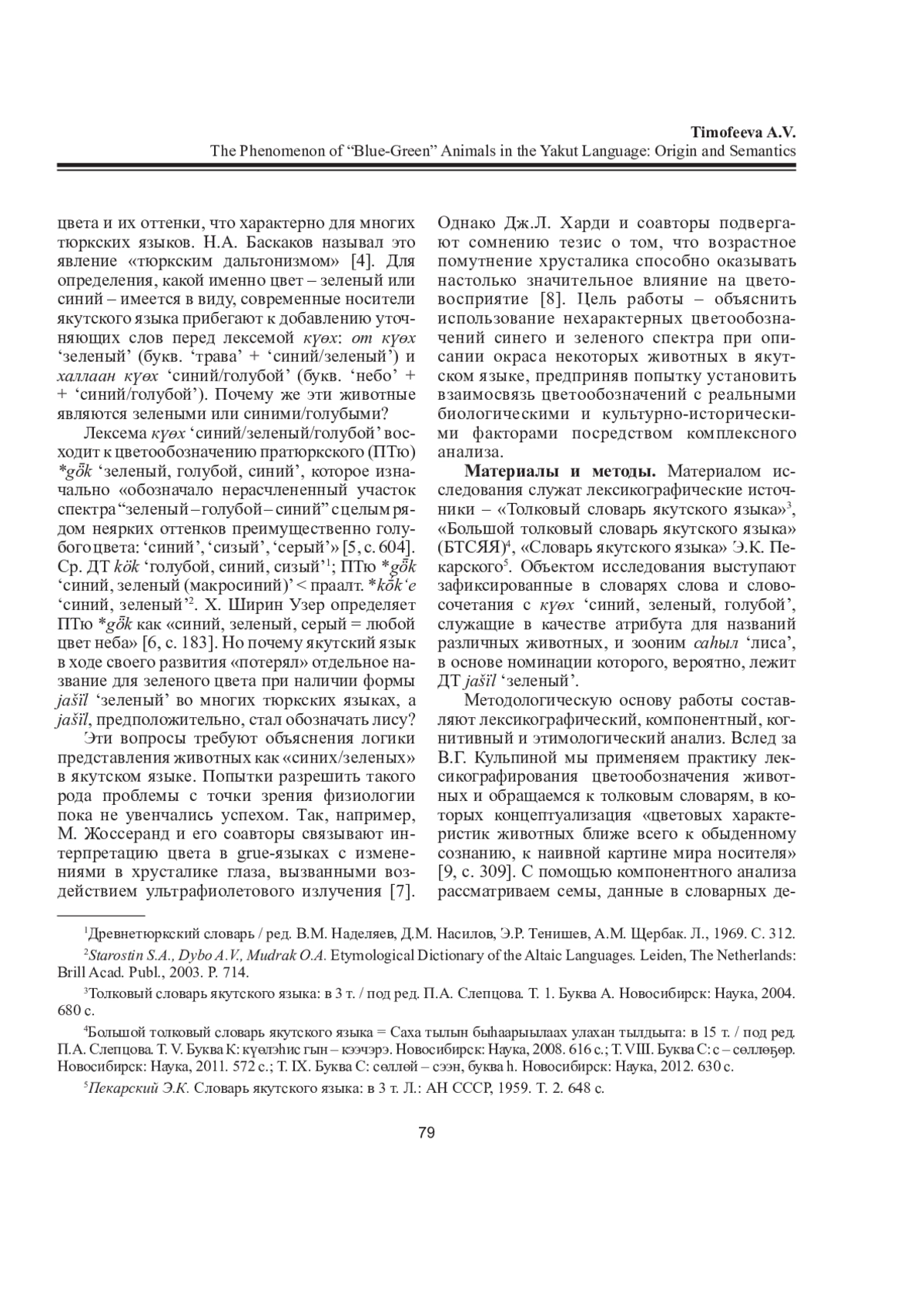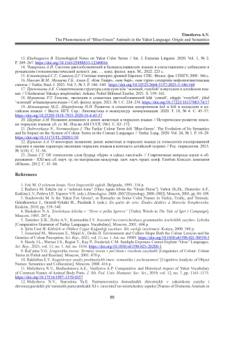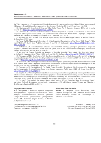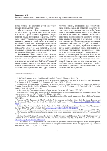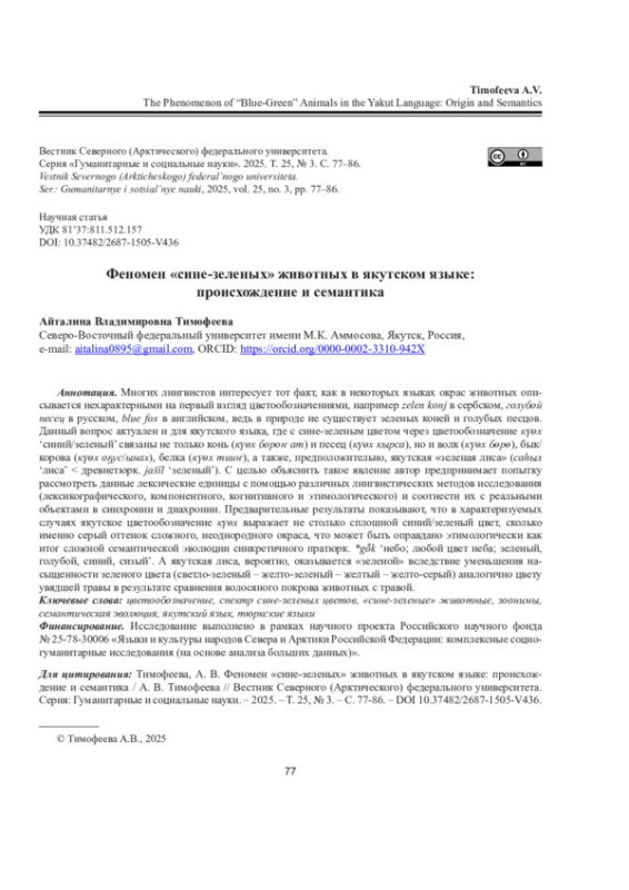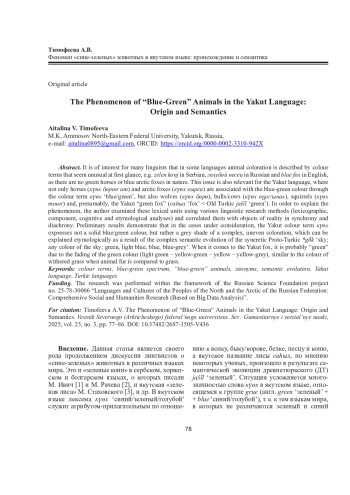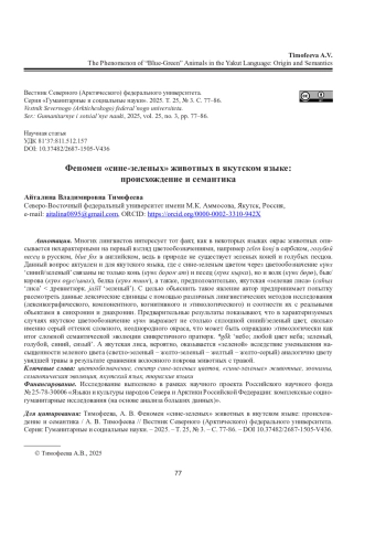 ТИМОФЕЕВА А. В. ФЕНОМЕН «СИНЕ-ЗЕЛЕНЫХ» ЖИВОТНЫХ В ЯКУТСКОМ ЯЗЫКЕ: ПРОИСХОЖДЕНИЕ И СЕМАНТИКА // ВЕСТНИК СЕВЕРНОГО (АРКТИЧЕСКОГО) ФЕДЕРАЛЬНОГО УНИВЕРСИТЕТА. СЕРИЯ: ГУМАНИТАРНЫЕ И СОЦИАЛЬНЫЕ НАУКИ. 2025. Т. 25 № 3