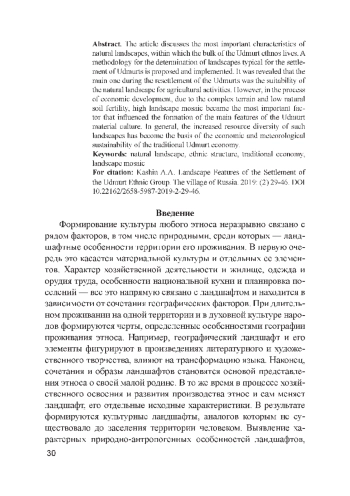 Цель статьи — проанализировать важнейшие характеристики природных ландшафтов, в пределах которых проживает основная часть удмуртского этноса. Предлагается и реализуется методика определения ландшафтов, типичных для расселения удмуртов. Результаты. Выявлено, что основным при расселении удмуртов была пригодность природного ландшафта для аграрной деятельности. Однако в процессе хозяйственного освоения из-за сложного рельефа территории и невысокого естественного плодородия почв высокая ландшафтная мозаичность стала важнейшим фактором, повлиявшим на формирование основных черт материальной культуры удмуртов. В целом, повышенное ресурсное разнообразие таких ландшафтов стало основой экономической и метеорологической устойчивости традиционного хозяйства удмуртов.