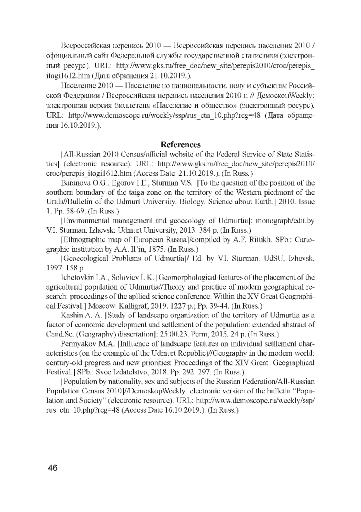 4. Кашин А. А. Исследование ландшафтной организации территории Удмуртии как фактора хозяйственного освоения и расселения населения: автореф. дис.... канд. геогр. наук: 25.00.23. Пермь, 2015. 24 с.