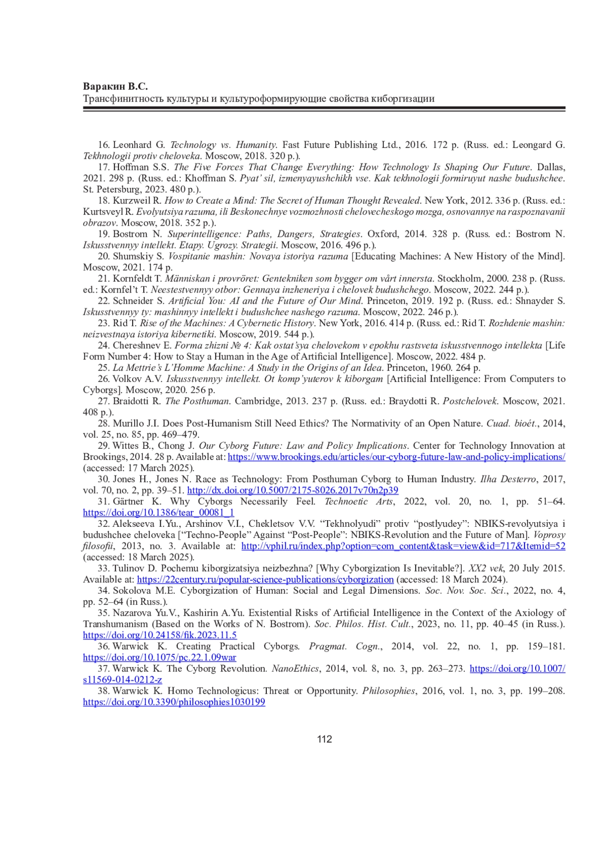 42. Варакин В.С. Киборгизация in toto: техночеловек между подчинением и починкой // Актуальные вопросы гуманитарных наук - 2024: материалы выступлений молодых ученых в рамках Ломоносов. чтений 2024 / отв. ред. Т.Н. Астахова. Архангельск: САФУ, 2024. С. 20-25. URL: https://narfu.ru/upload/medialibrary/91c/Aktualnye-voprosy-gumanitarnyh-nauk-_-2024.pdf (дата обращения: 18.03.2025). EDN: HNAHDE