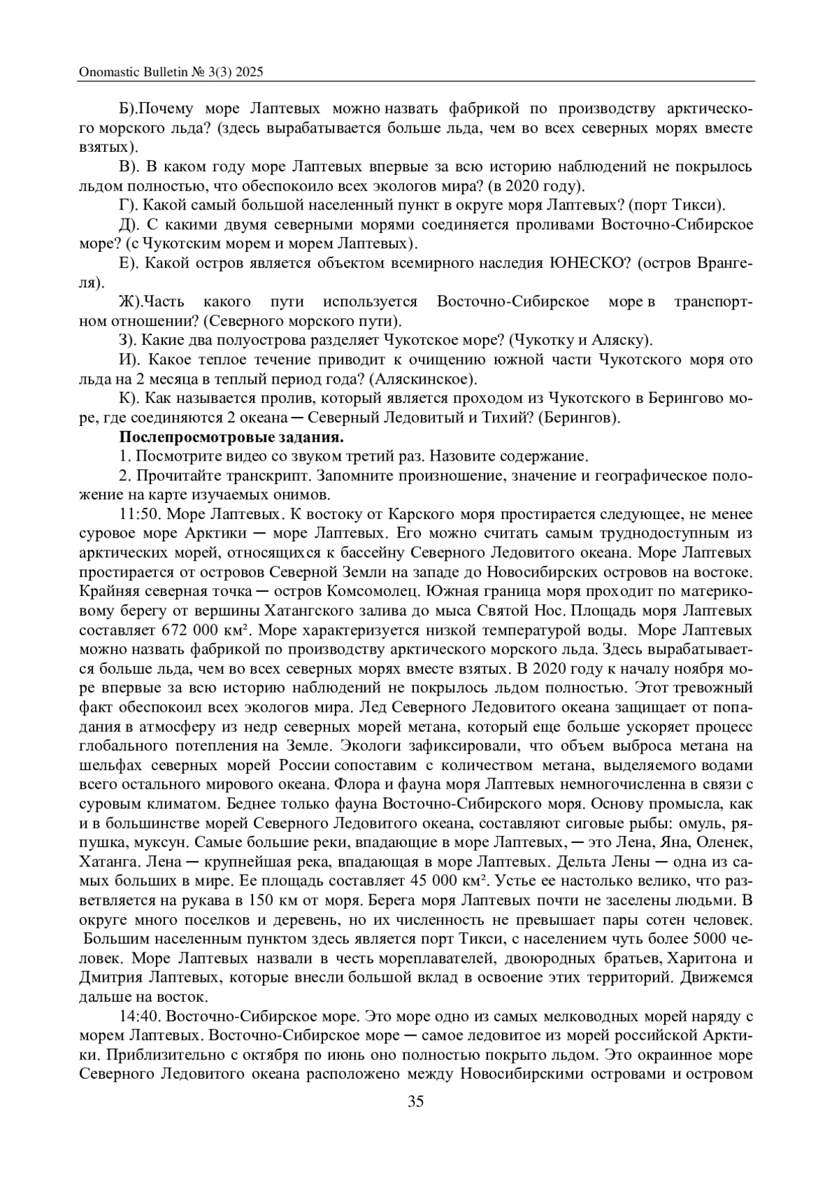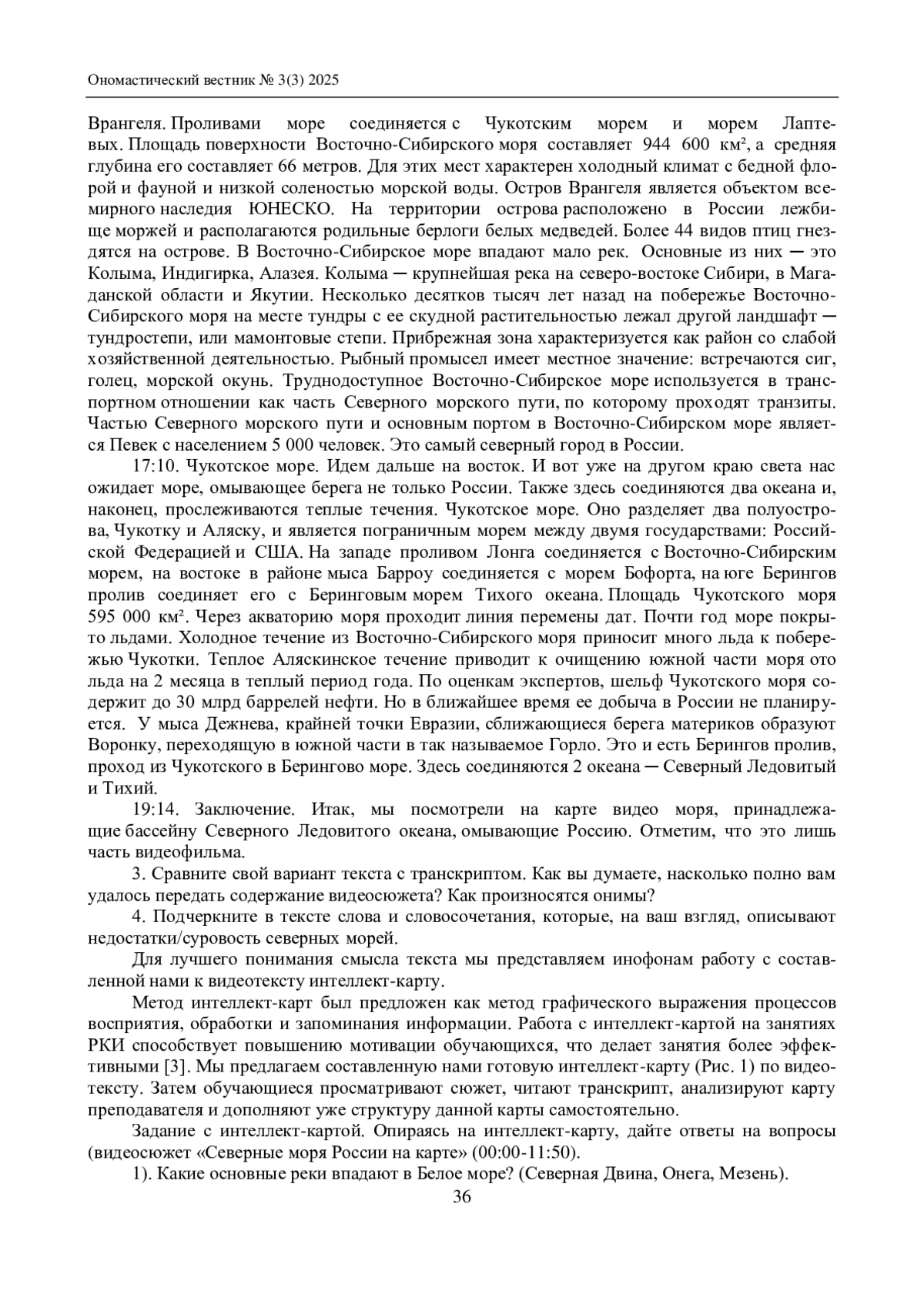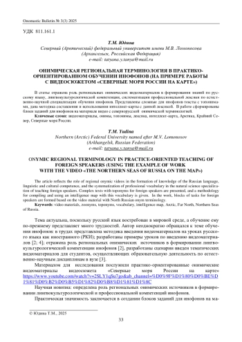 В статье отражена роль региональных онимических видеоматериалов в формировании знаний по русскому языку, лингвокультурологической компетенции, систематизации профессиональной лексики по естественно-научной специализации обучения инофонов. Представлены сложные для инофонов тексты с топонимами, дана методика составления и использования интеллект-карты с данной лексикой. В работе сформированы блоки заданий для инофонов на материале видео с севернорусской онимической терминологией.