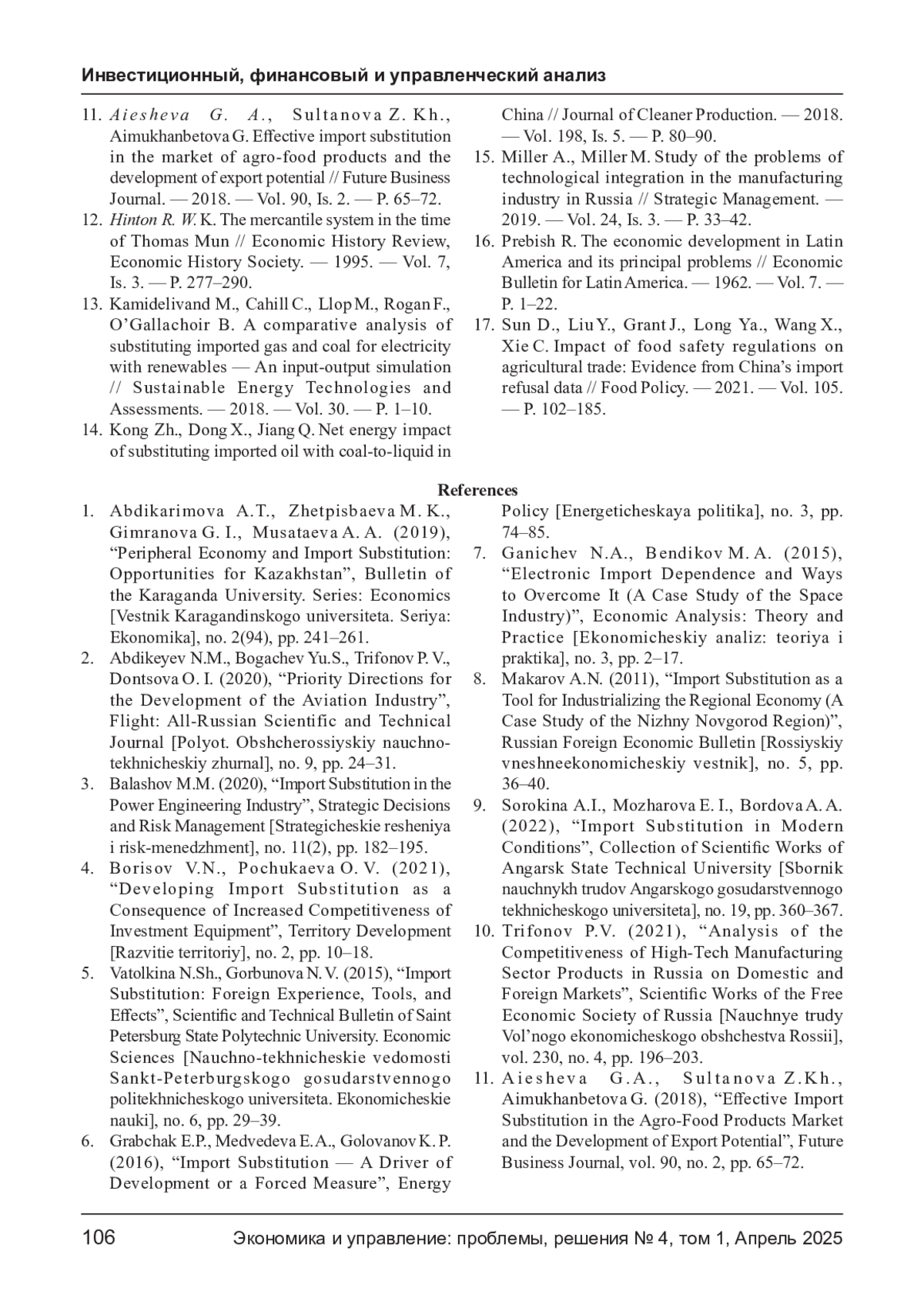 11. Aiesheva G. A., Sultanova Z. Kh., Aimukhanbetova G. Effective import substitution in the market of agro-food products and the development of export potential // Future Business Journal. - 2018. - Vol. 90, Is. 2. - P. 65-72.